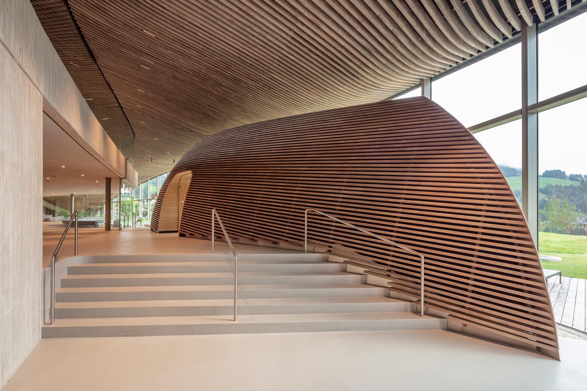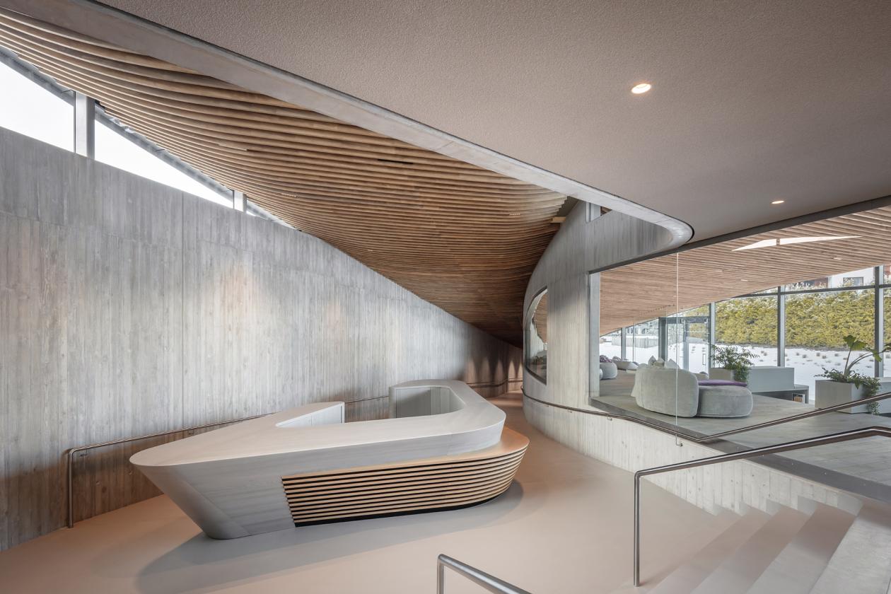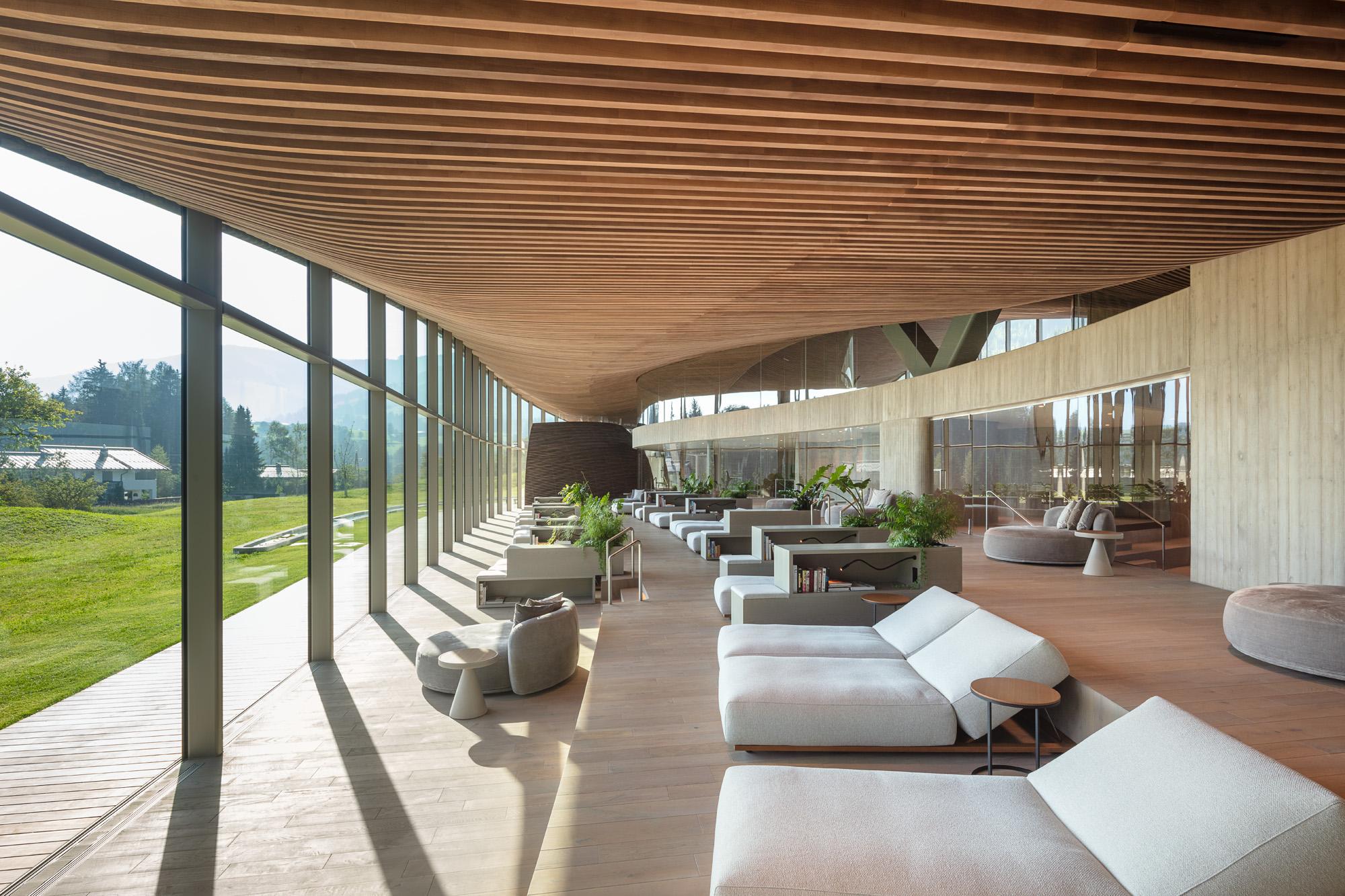 Der Entwurf besteht aus einer geschwungenen und gestaffelten Dachkonstruktion, die sich in den Grünraum als 100 Meter weit gespanntes grünes Landschaftselement einfügt. Der wetterunabhängige Zugang verbindet Hotel und SPA direkt und wird auf halbem Weg durch einen spiralförmigen, in die Tiefe führenden Hof akzentuiert. Dieser bietet dem Besucher die Möglichkeit weiter in das Innere mit seinen vielfältigen Angeboten einzutauchen oder den neu angelegten 5.500 Quadratmeter großen Natursee als Herzstück der neu geschaffenen Landschaft rundum zu erkunden. Dabei führt der Weg auch über das Dach des SPA. Wichtiger Entwurfsgedanke war vor allem, die weiten Ausblicke aus dem Hotel nicht einzuschränken und den Neubau als integralen Bestandteil in die Topografie des alpinen Geländes einzufügen.