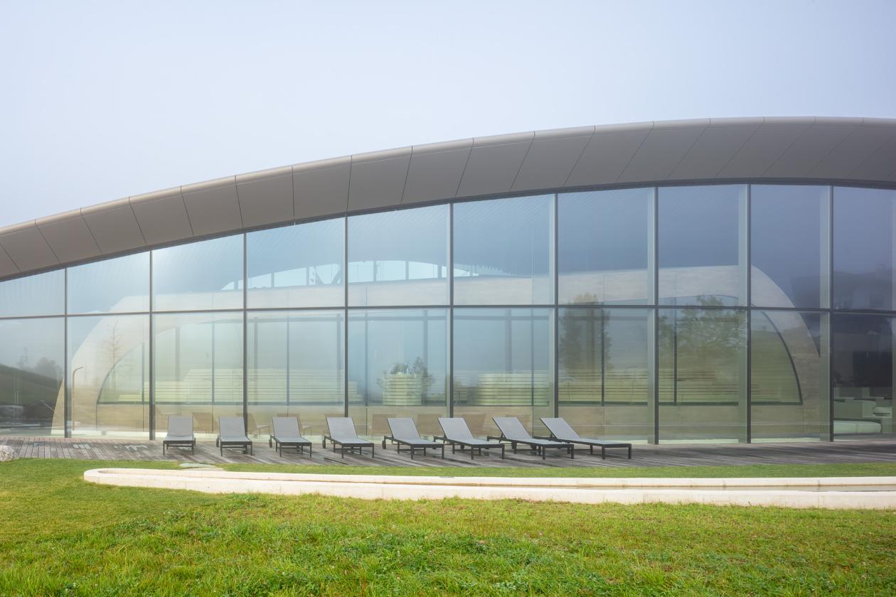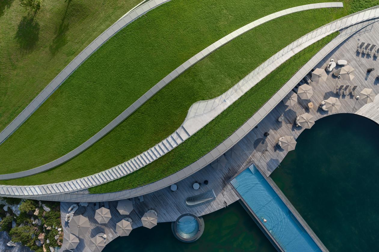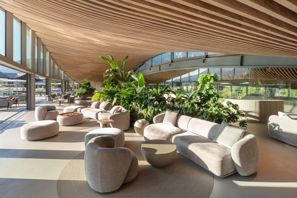 Der Entwurf besteht aus einer geschwungenen und gestaffelten Dachkonstruktion, die sich in den Grünraum als 100 Meter weit gespanntes grünes Landschaftselement einfügt. Der wetterunabhängige Zugang verbindet Hotel und SPA direkt und wird auf halbem Weg durch einen spiralförmigen, in die Tiefe führenden Hof akzentuiert. Dieser bietet dem Besucher die Möglichkeit weiter in das Innere mit seinen vielfältigen Angeboten einzutauchen oder den neu angelegten 5.500 Quadratmeter großen Natursee als Herzstück der neu geschaffenen Landschaft rundum zu erkunden. Dabei führt der Weg auch über das Dach des SPA. Wichtiger Entwurfsgedanke war vor allem, die weiten Ausblicke aus dem Hotel nicht einzuschränken und den Neubau als integralen Bestandteil in die Topografie des alpinen Geländes einzufügen.