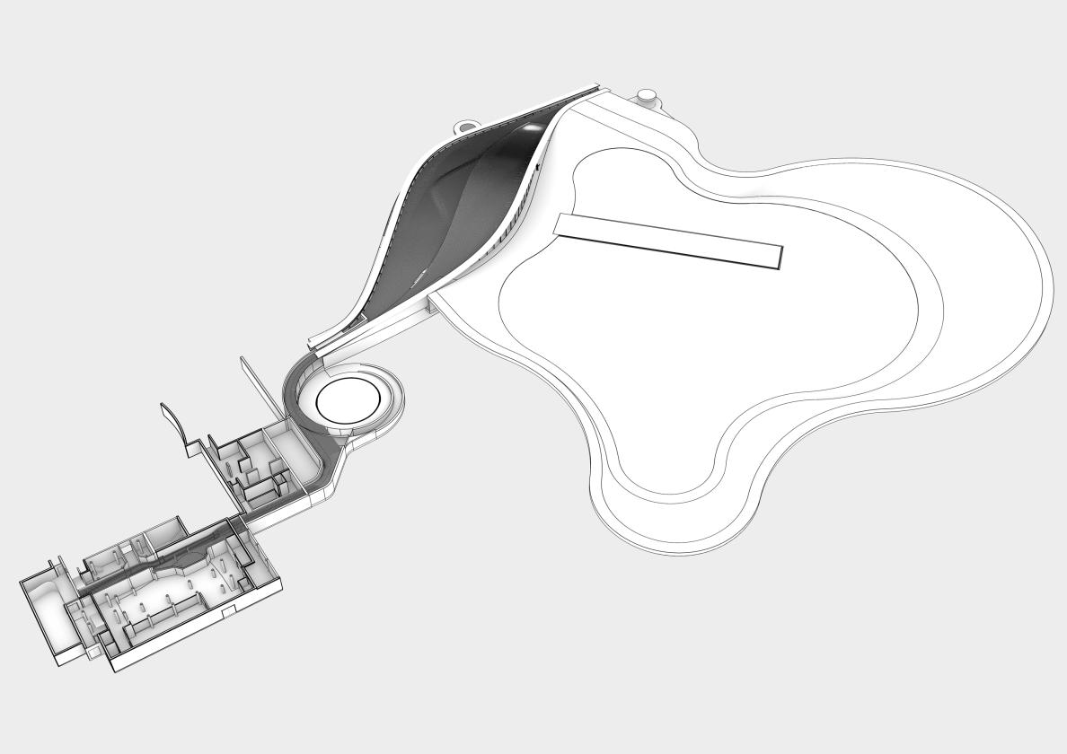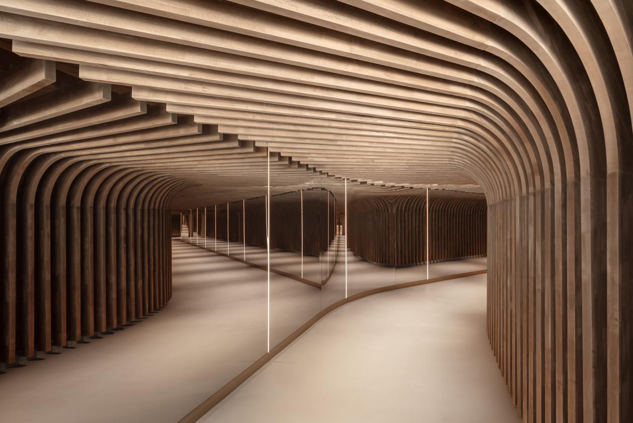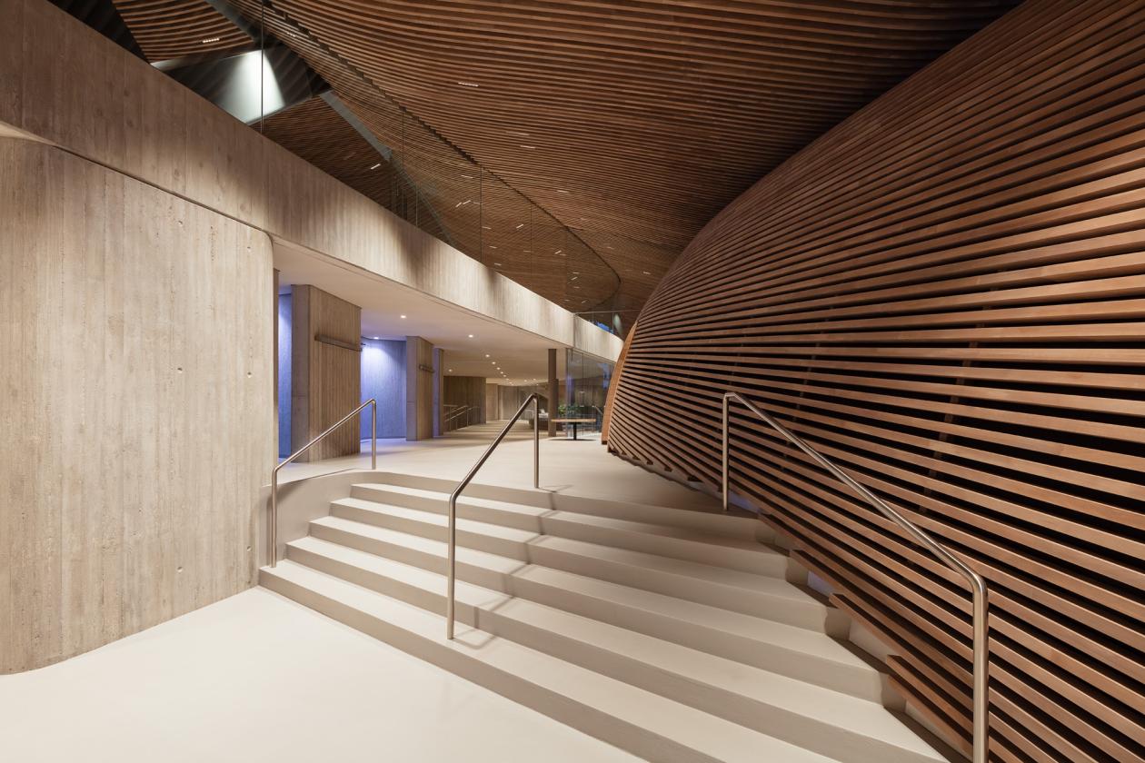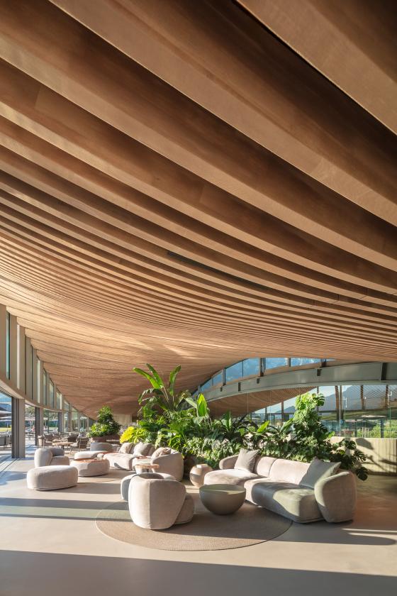 Als verbindendes Gestaltungselement dient die geschwungene Lamellendecke aus Holz. Auf eine Lauflänge von 175 Metern verbindet diese den Bestand mit dem Endpunkt des Hauptdachs. Die CNC-gefräste Konstruktion folgt dabei der sich immer wieder ändernden Geometrie und wird zum Bindeglied aller Bauteile.