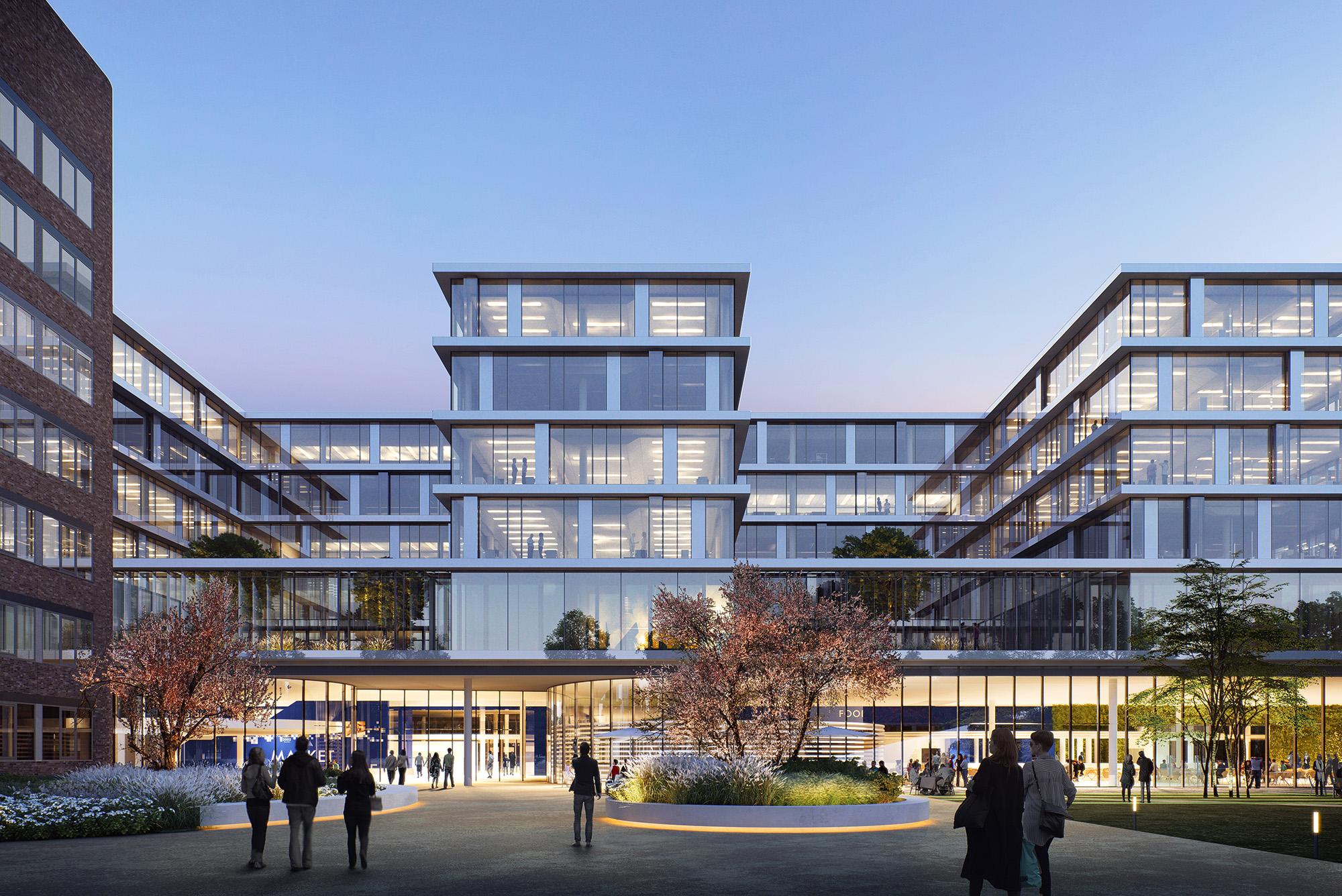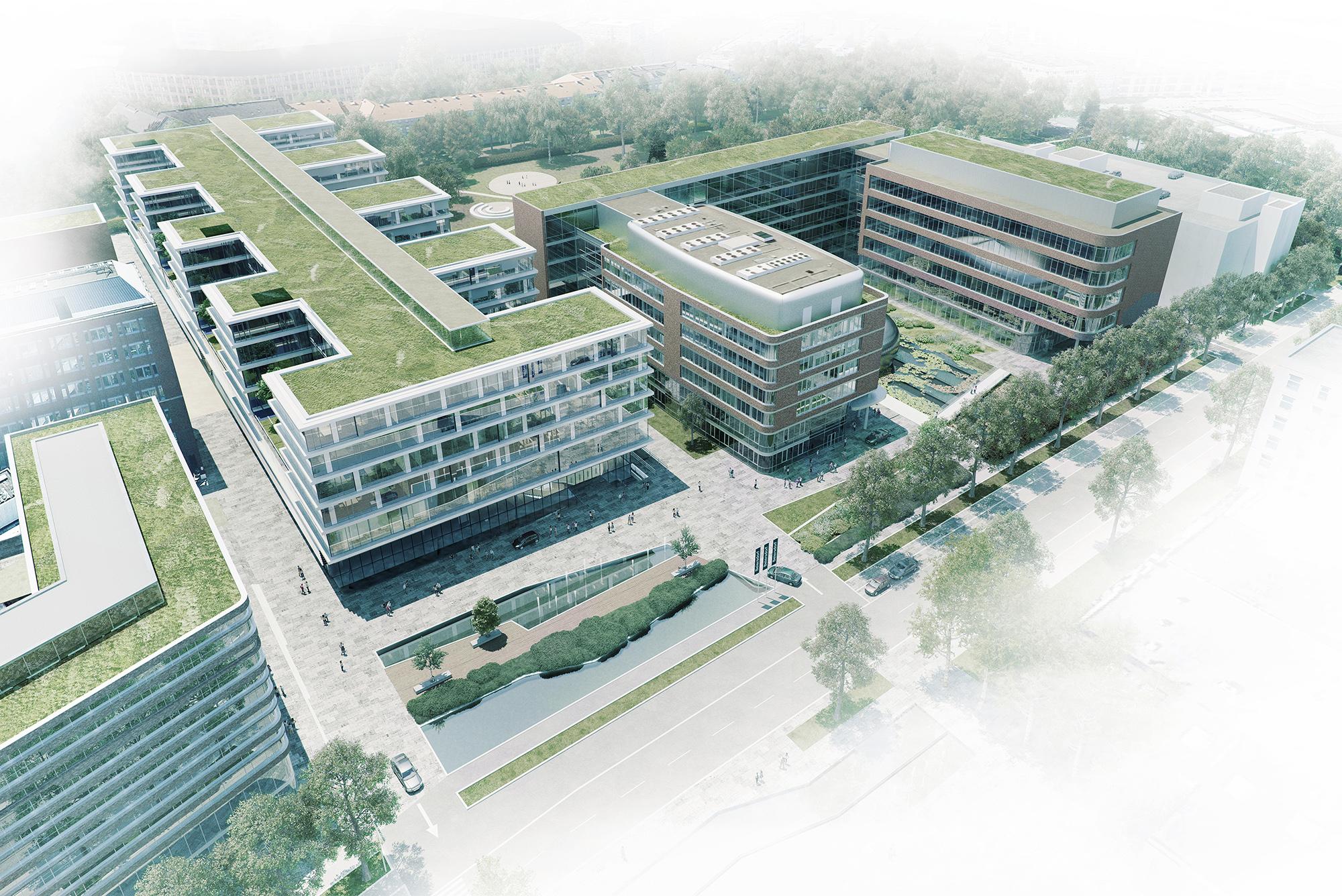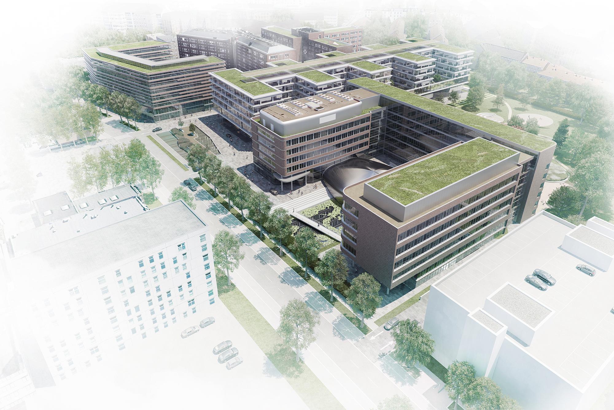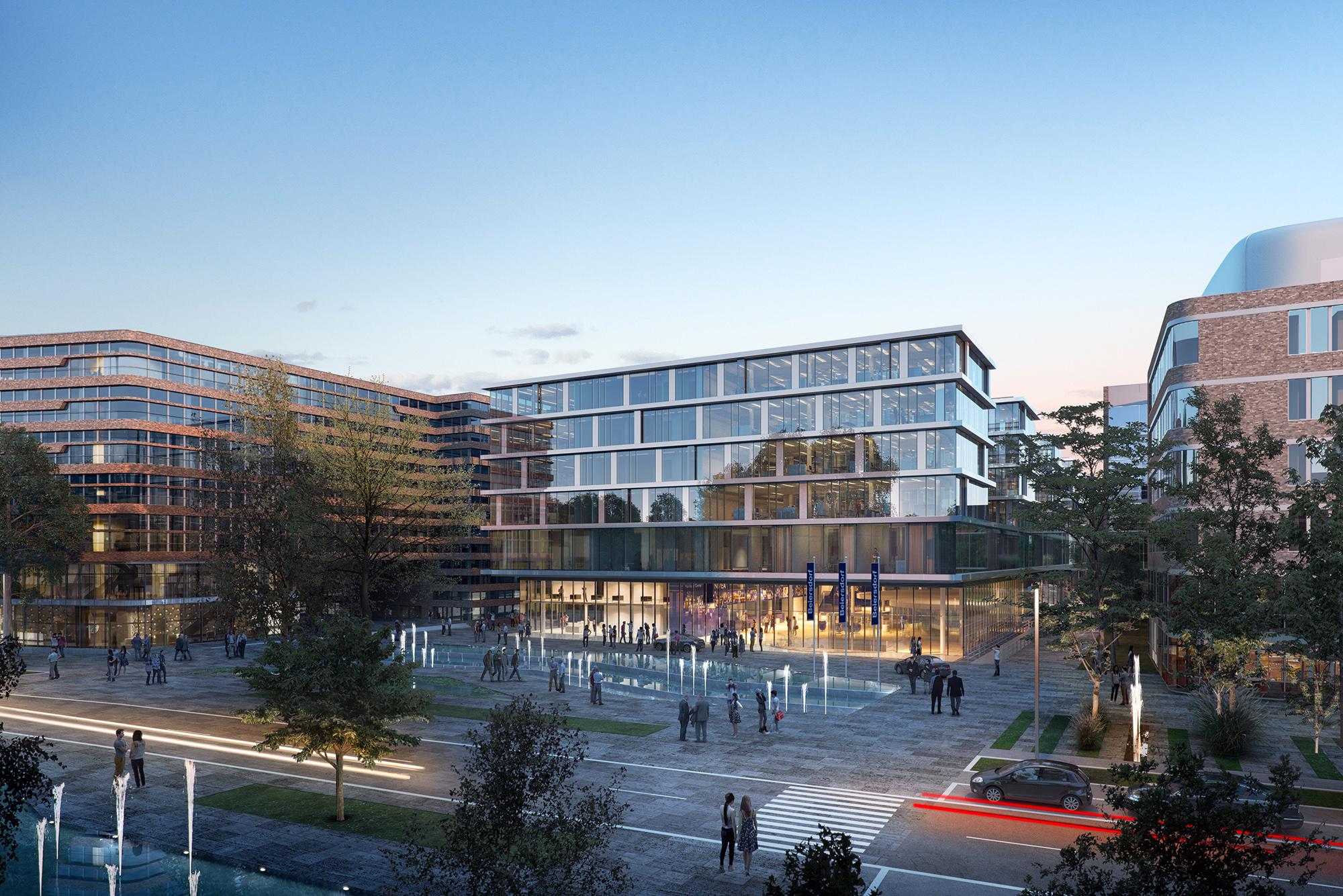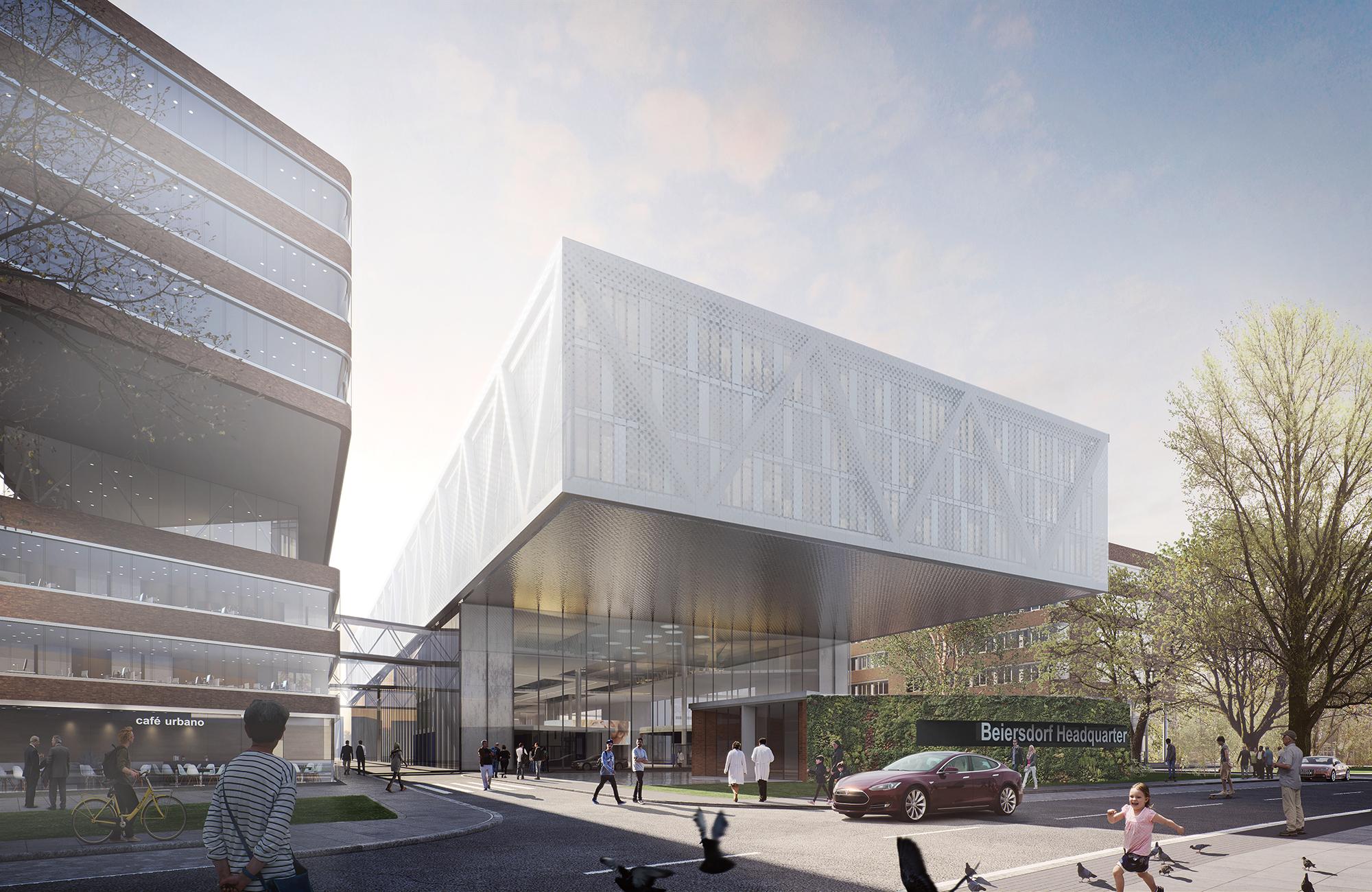 KonzernzentraleHamburg, DFür den Hamburger Weltkonzern Beiersdorf hat Hadi Teherani eine neue Konzernzentrale entworfen, die den ‚Code’ der Traditionsunternehmen in Architektur umsetzt und gleichzeitig den Anforderungen modernen Arbeitens und effizienten Bauens entspricht. Im dreiphasigen Wettbewerb überzeugte das sechsgeschossige Gebäude, das sich durch seine transparente Fassade zurückhaltend und elegant in die Bestandsbauten wie auch die umgebende Wohnbebauung einfügt und eine neue, identitätsstiftende Mitte für das gesamte Beiersdorf-Gelände in Hamburg Eimsbüttel generiert. Die öffentlichen Flächen und der grüne, neu geschaffene, zentrale Campus integrieren das Areal zusätzlich in den Stadtteil. Um eine möglichst optimierte Nutzung zu erzielen, wurde das Gebäude quasi ‚angehoben’ – so kann die Erdgeschosszone mit ihren Sondernutzungen quasi stützenlos offen und flexibel gestaltet werden und gleichzeitig die darüber liegenden Arbeitswelten nahezu idealtypisch realisiert werden. Das Gebäude hat einen kammartigen Grundriss – in den fünf Riegeln der Obergeschosse sind die Büro- und Konferenzräume untergebracht – auf rund 95.000 qm Geschossfläche werden künftig etwa 3.000 Arbeitsplätze auf dem Areal angesiedelt sein.