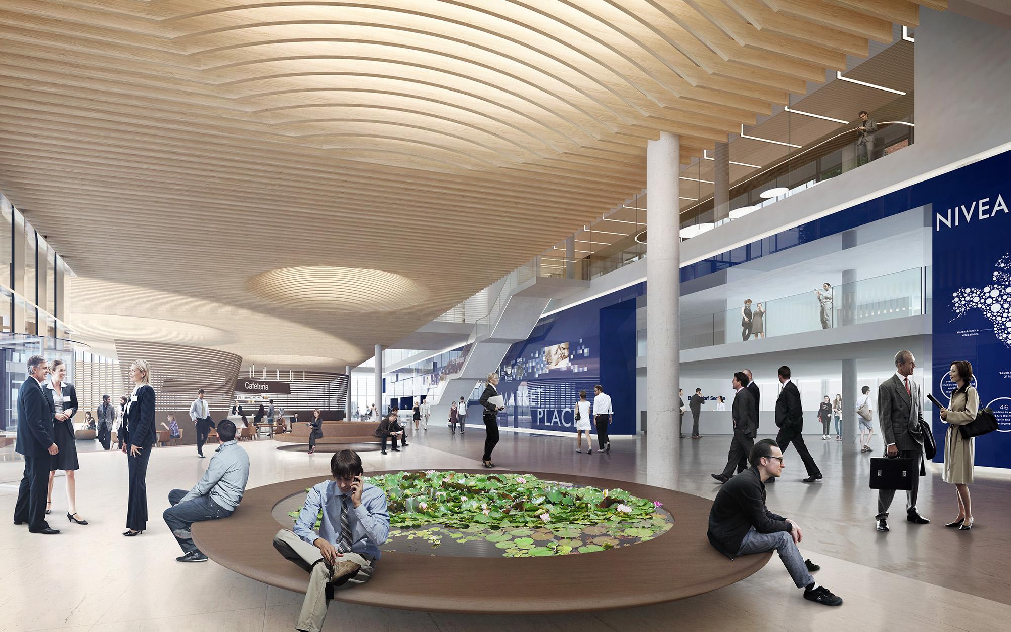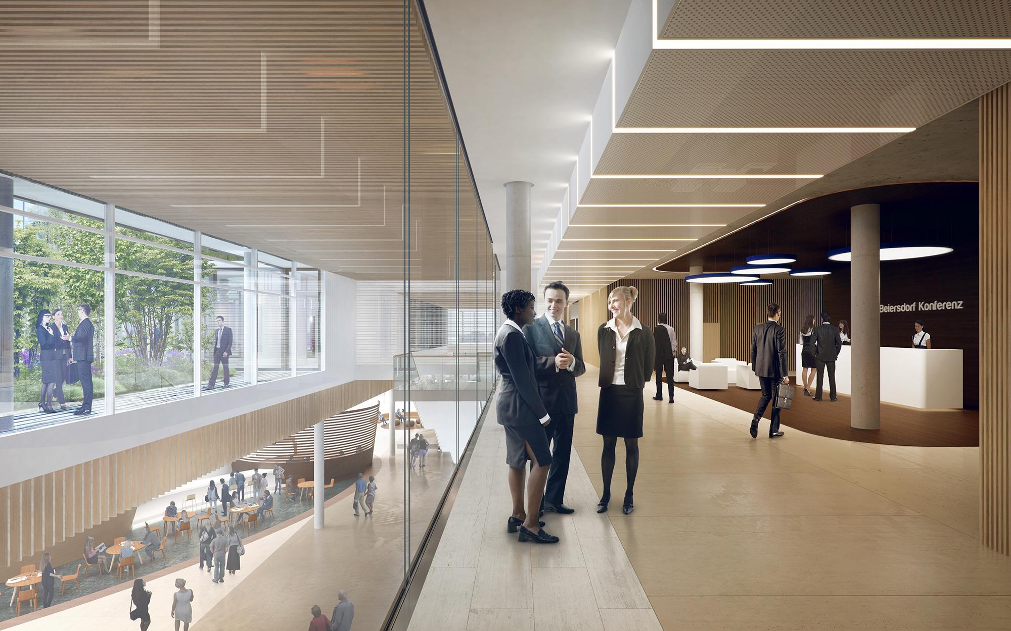 Der zentrale Haupteingang liegt an der Troplowitzstraße: die durch ein Wasserbassin mit Fontänen einladend gestaltete, repräsentative Eingangszone führt den Besucher in den lichtdurchfluteten Empfangsbereich im Inneren. Zentrales Element der Eingangssituation ist die „Blue Wall“, welche sich über die ganze Länge des Erdgeschosses entwickelt. In Nivea-Blau gehalten und mit Bildern, Objekten der Markenwelt und Akustik bespielt, führt sie sowohl die Mitarbeiter als auch die Besucher subtil durch die Konzernwelt und weiter in das Gebäude hinein. Die offene Atmosphäre des Eingangsbereiches wird durch die geschosshohen, transparenten Verglasungen optimiert – Außen und Innen gehen hier fließend ineinander über und unterstreichen so den Campusgedanken.