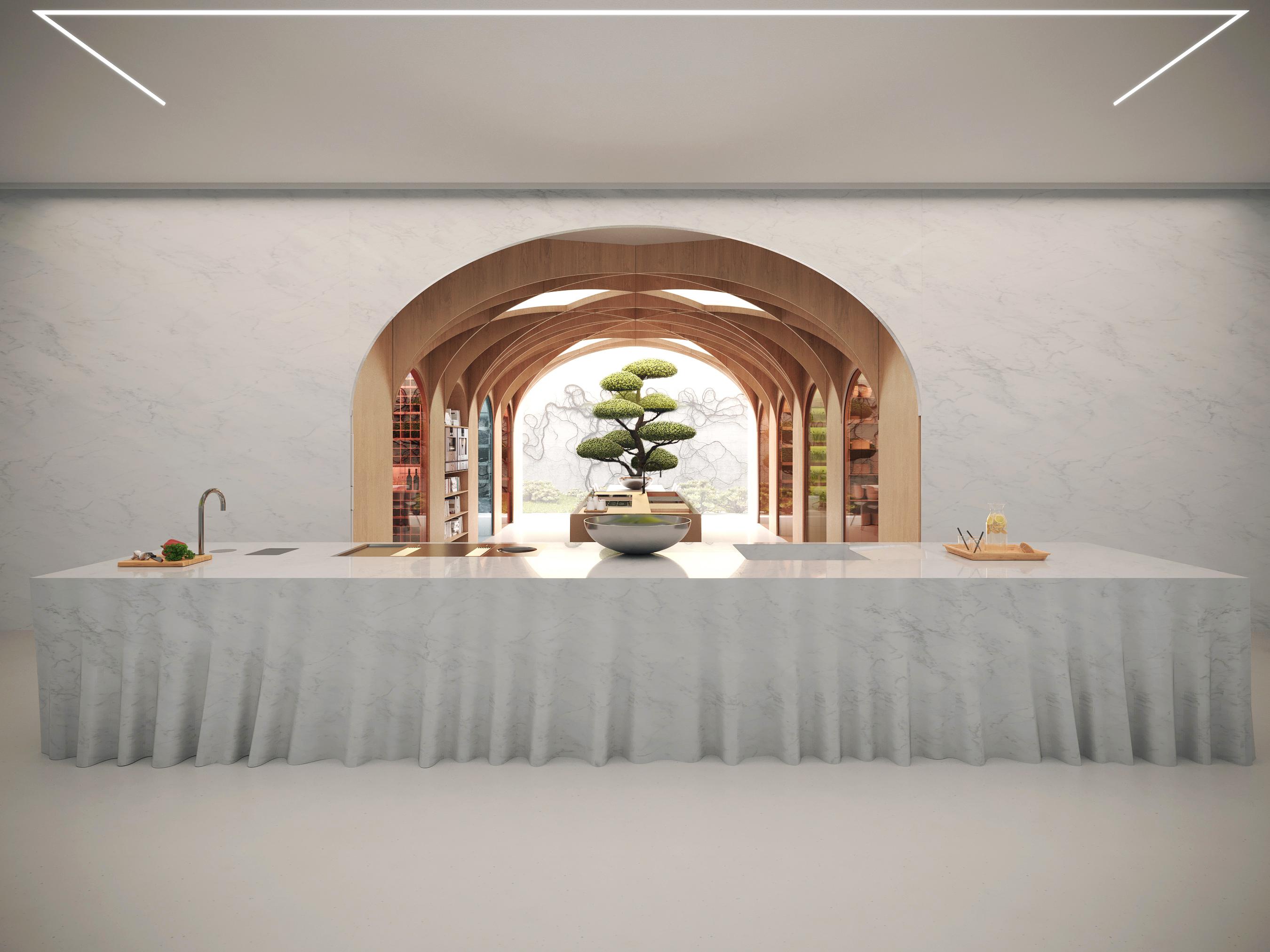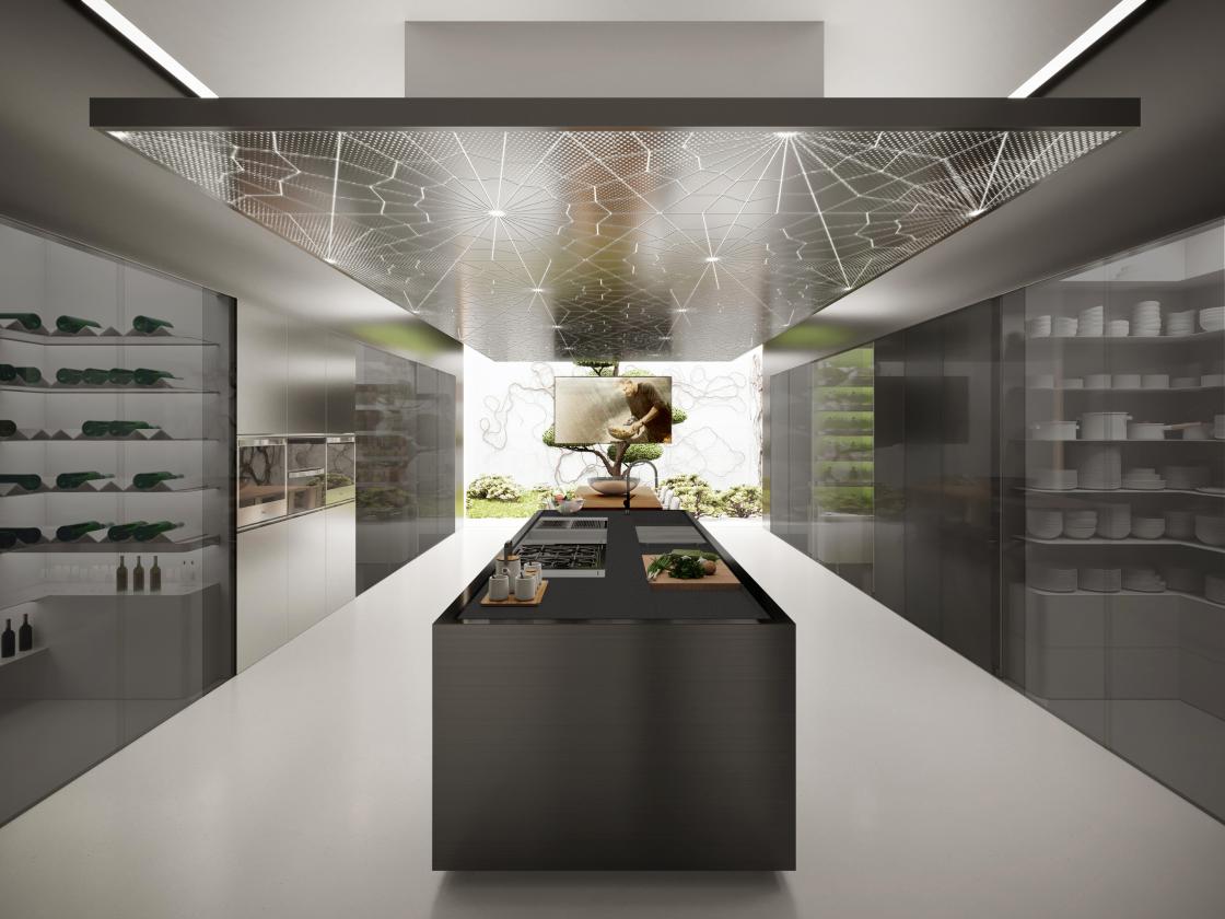 Die Boutique Kitchen ist als Raum-im-Raum-Konzept entworfen. Im Zentrum steht ein offener Küchenblock im Wohnbereich, der als repräsentativer Treffpunkt für Gäste dient – ein Ort für Show-Cooking, Kommunikation und stilvolle Bewirtung. Hinter diesem Bereich liegt ein voll ausgestatteter Back-Kitchen-Raum, in dem alle funktionalen Anforderungen erfüllt werden – bis hin zur Nutzung durch Personal. Hier kann uneingeschränkt gekocht und vorbereitet werden, während der vordere Bereich elegant und einladend bleibt.