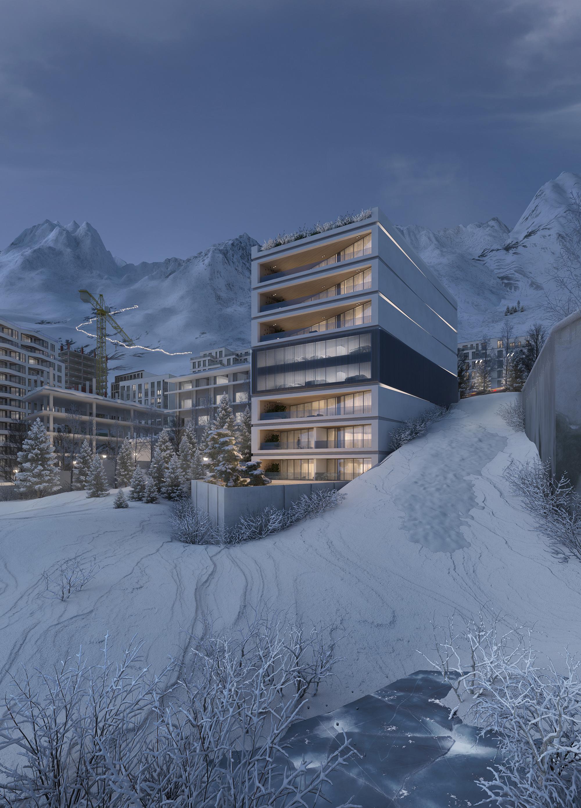 Der Baukörper überzeugt durch eine plastisch gegliederte Natursteinfassade in Kombination mit großflächigen Curtain-Wall-Verglasungen, die Innen- und Außenraum fließend miteinander verbinden. Orientierung und Ausrichtung des Gebäudes eröffnen spektakuläre Ausblicke: im Norden auf die Skipisten, im Süden auf das weitläufige Tal.