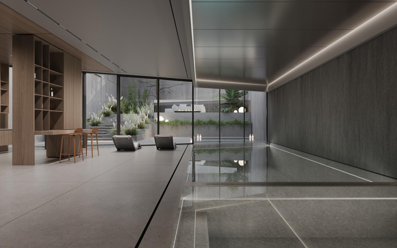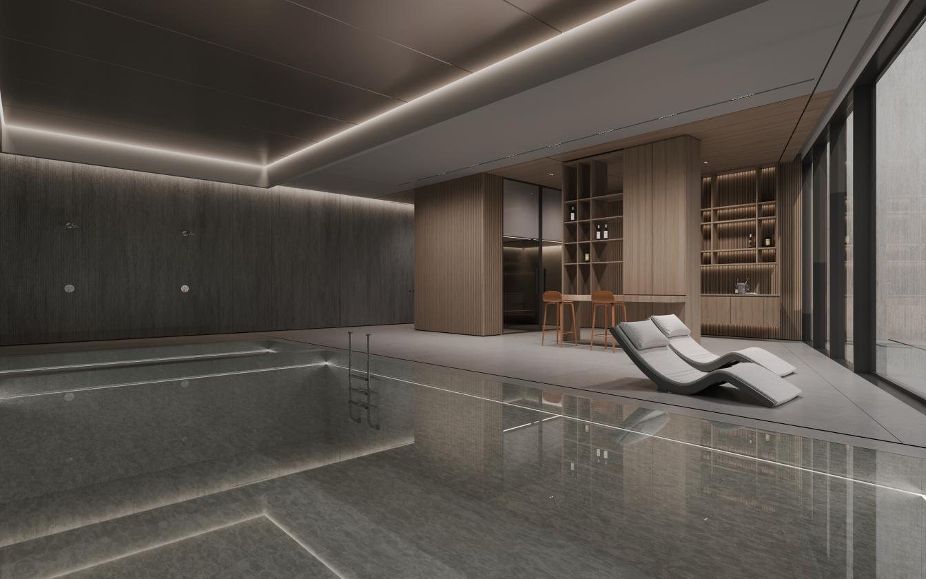 Die Innenarchitektur zeichnet sich durch edle Materialien, maßgeschneiderte Details und eine räumliche Dramaturgie aus, die im doppelgeschossigen Eingangsfoyer ihren Auftakt findet. Exklusive Annehmlichkeiten wie ein 15-Meter-Pool mit Spa-Bereich, Fitness und Lounge, private Aufzugslobbys und 84 Tiefgaragenstellplätze unterstreichen den hohen Komfort.