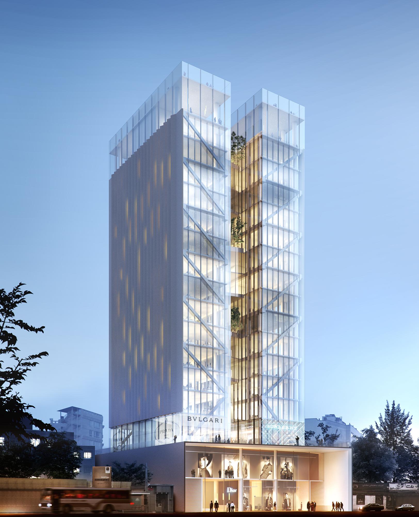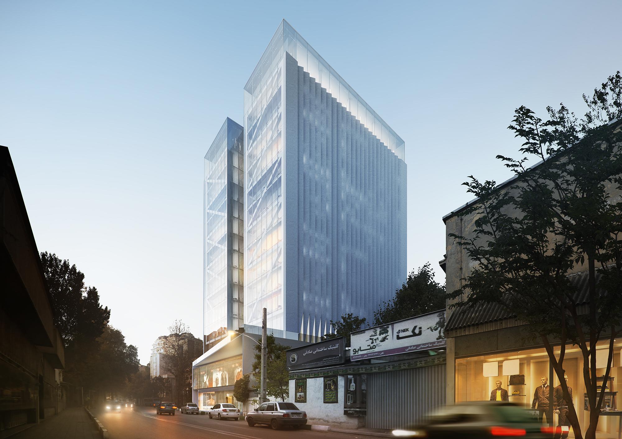 Büro- und GeschäftsgebäudeTeheran, IranDas Stadtviertel Farmanieh (Farmaniye), liegt am nördlichen Rand von Teheran. Der Entwurf sieht eine viergeschossige Shopping Mall mit zwei 14-geschossigen Bürotürmen und einem Restaurant mit Dachgarten vor. Die Hochhäuser werden durch Gärten und Büros verbunden.