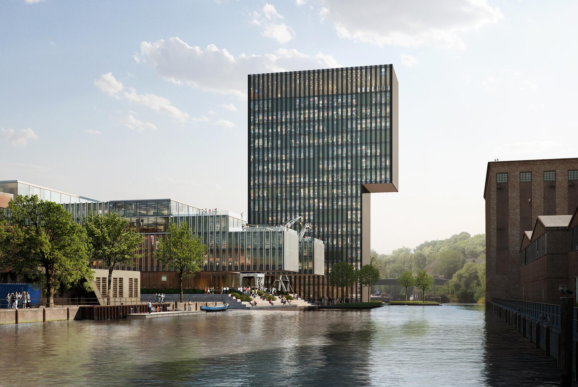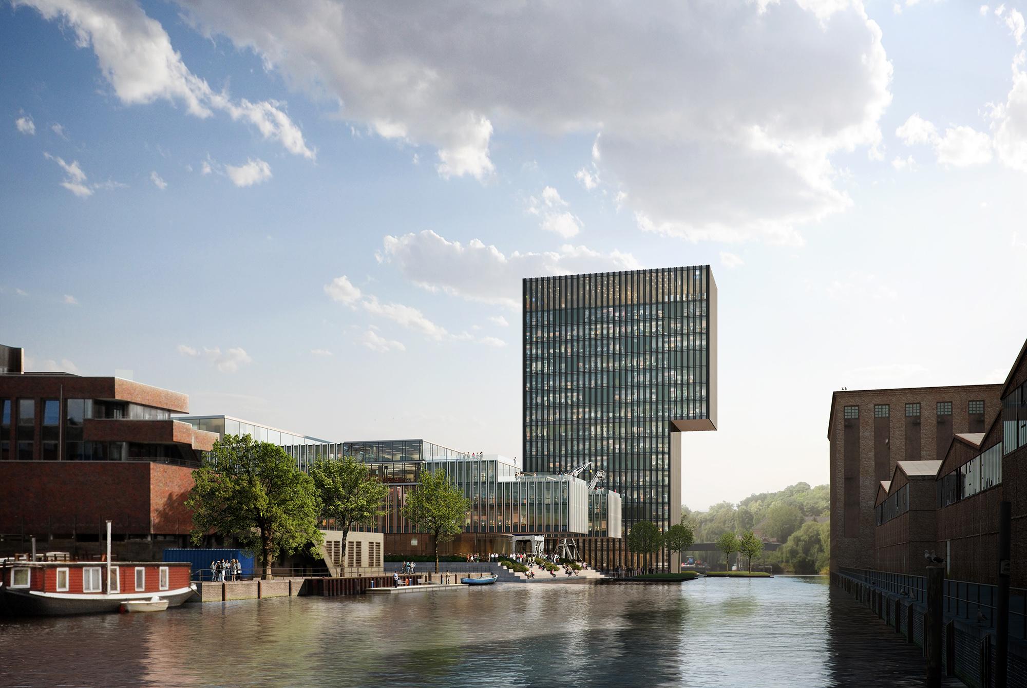 Eine elegante Architektursprache mit Bürotower direkt am Wasser, öffentlicher Piazza und begrünten Sockel soll gemeinsam mit MVRDV, die für den Masterplan ausgezeichnet wurden, in gemeinsamer Kooperation umgesetzt werden.