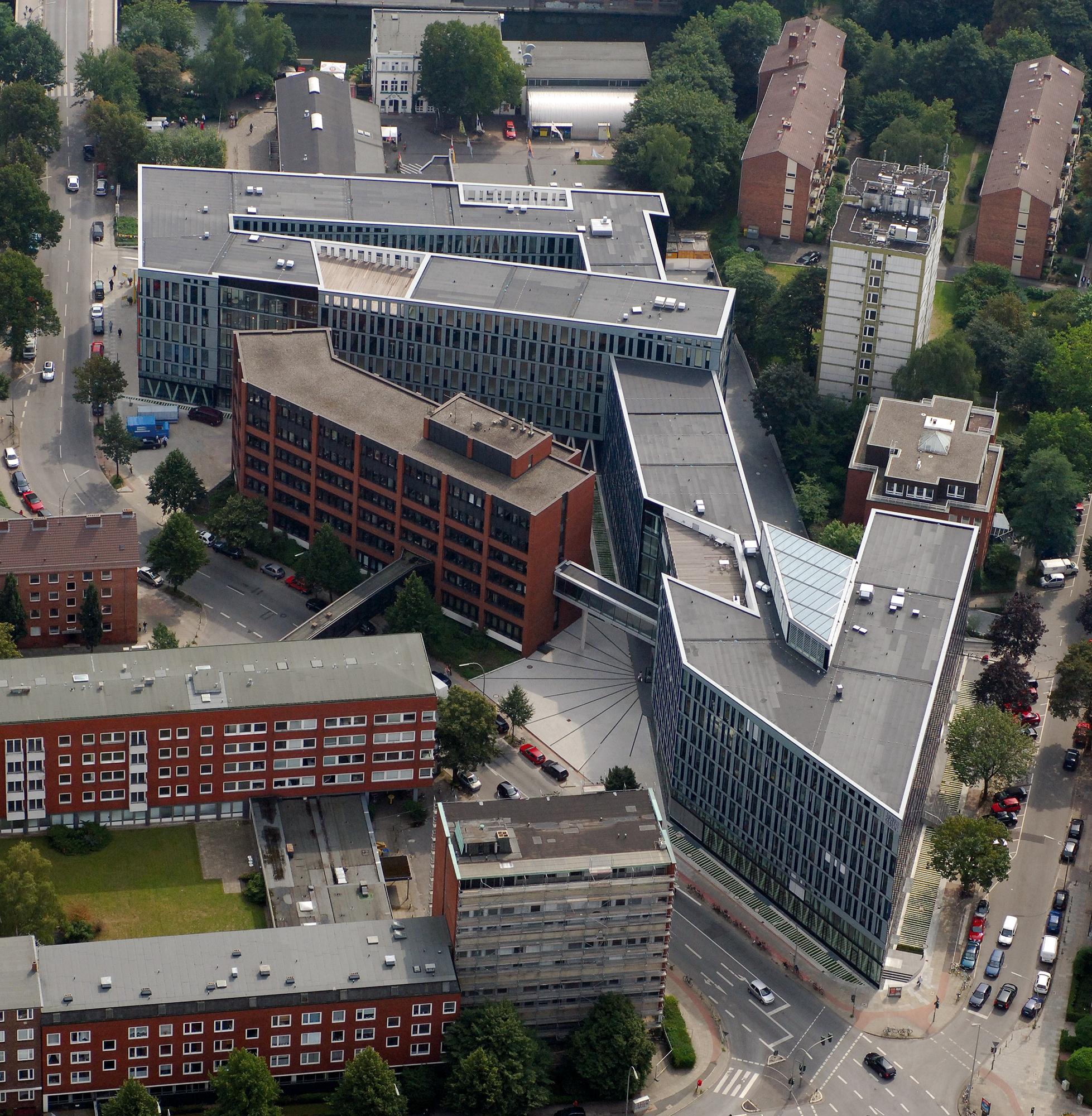 Über eine Fuge zwischen Bestandsbaukörper und Neubau am Poßmoorweg erfolgt die Erschließung des Verlagskomplexes. Die Verteilung der oberen Geschosse erfolgt über zwei in der Eingangshalle angeordneten Personenaufzügen, die über Brücken an die Geschossdecke angeschlossen sind. Bestand und Neubau werden im 2. OG durch eine weitere Brücke miteinander verbunden. Der Haupteingang anderer Mietungen ist zentral am Moorfurthweg angeordnet. Von hier aus erfolgt die Erschließung über dezentral angeordnete Eingangshallen mit individuellen Erschließungskernen. Die Tiefgarage wird über eine zweispurige Rampe am Moorfurthweg und einer einspurigen Rampe an der Dorotheenstraße erschlossen.