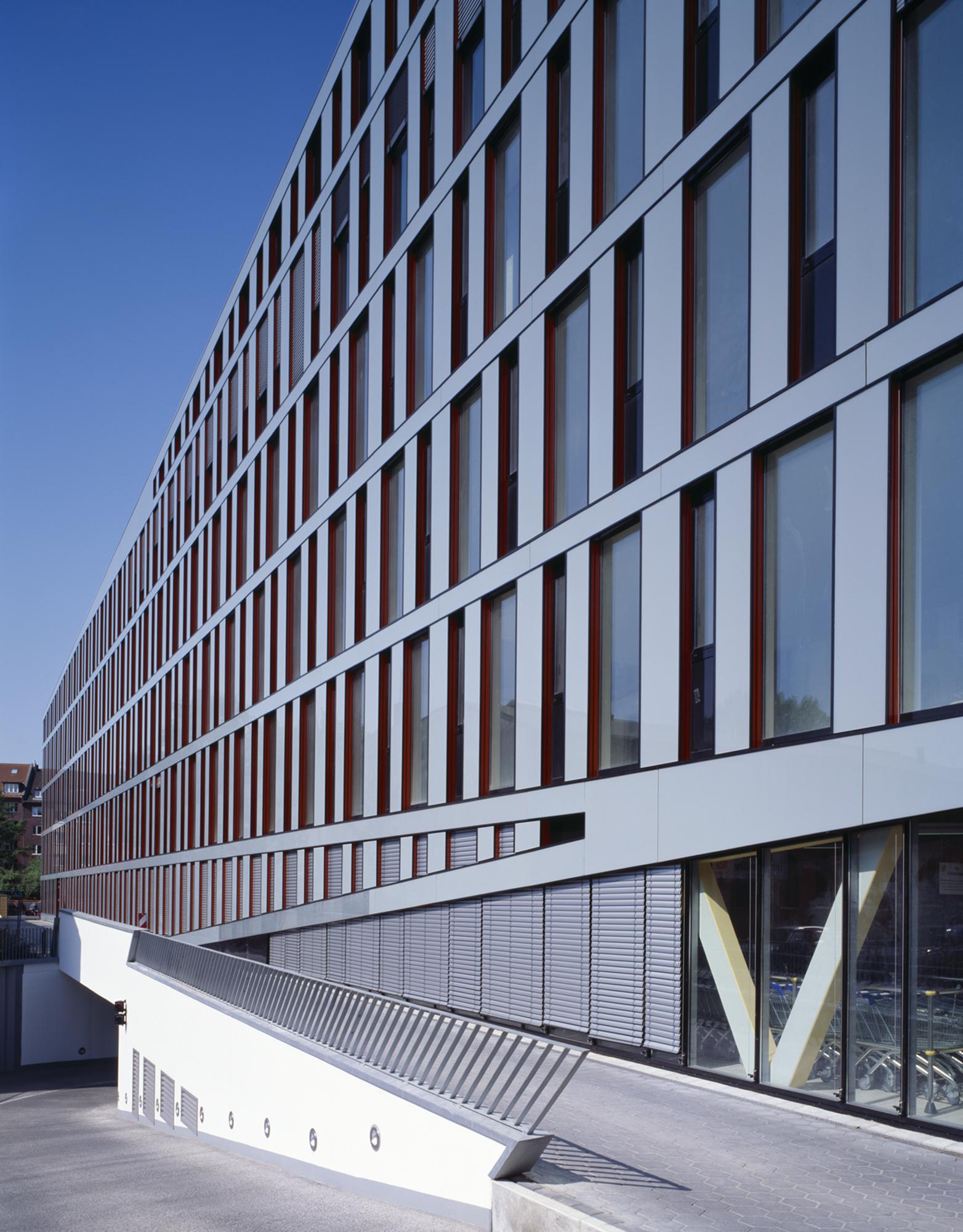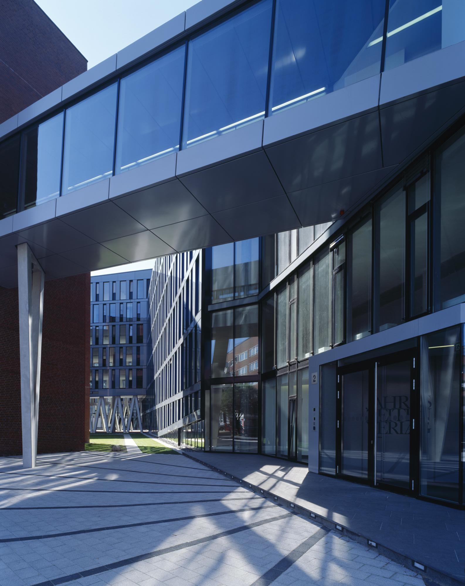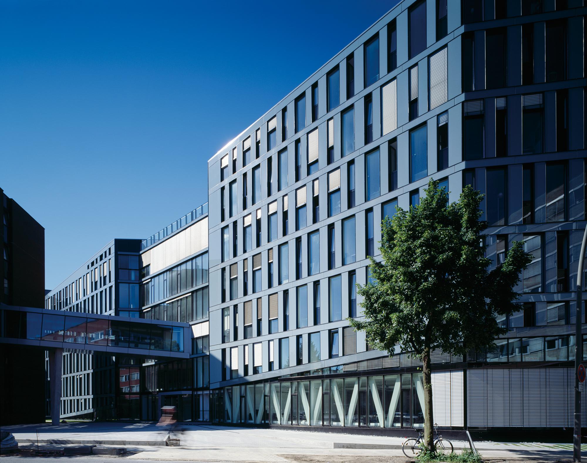 Die Hauptfassade besteht aus einem Muster aus geschossweise versetzten, fest verglasten und geschosshohen Fensterelementen. Die Fensterelemente sind individuell zu öffnen. Entsprechend der städteräumlich exponierten Situationen an der Kreuzung Poßmoorweg/Dorotheenstraße und im Eingangsbereich Moorfurthweg steigt der Baukörper um bis zu zwei Geschossen an und legt eine schräge und durchgehend verglaste untere ‚Sockelfassade’ frei. Die Hauptfassade besteht aus geschosshohen Fensterelementen – angeordnet zwischen Stahlbetonaußenstützen und den Geschossdecken – und einer Verkleidung der geschlossenen Fassadenbereiche aus emailliertem Glas sowie einer Unterkonstruktion und Wärmedämmung. Die untere ‚Sockelfassade’ umfasst die Bereiche des Erdgeschosses und des 1. OG unterhalb des schrägen Abschluss der Hauptfassade. Der Sonnenschutz besteht aus elektrisch betriebenen, außen liegenden Lamellenstores.