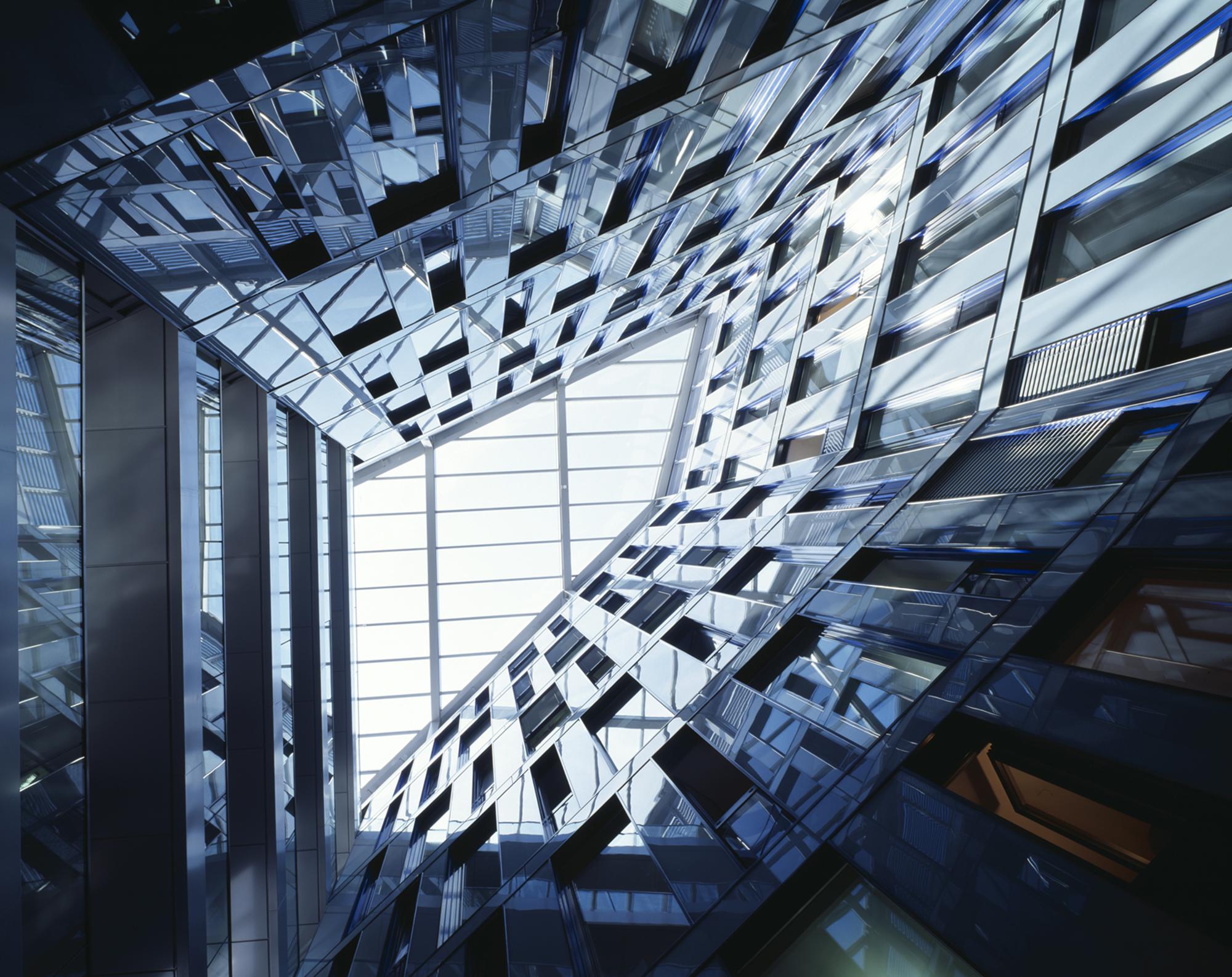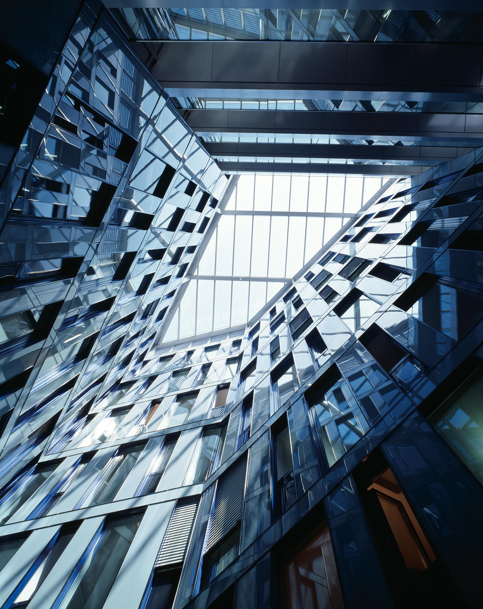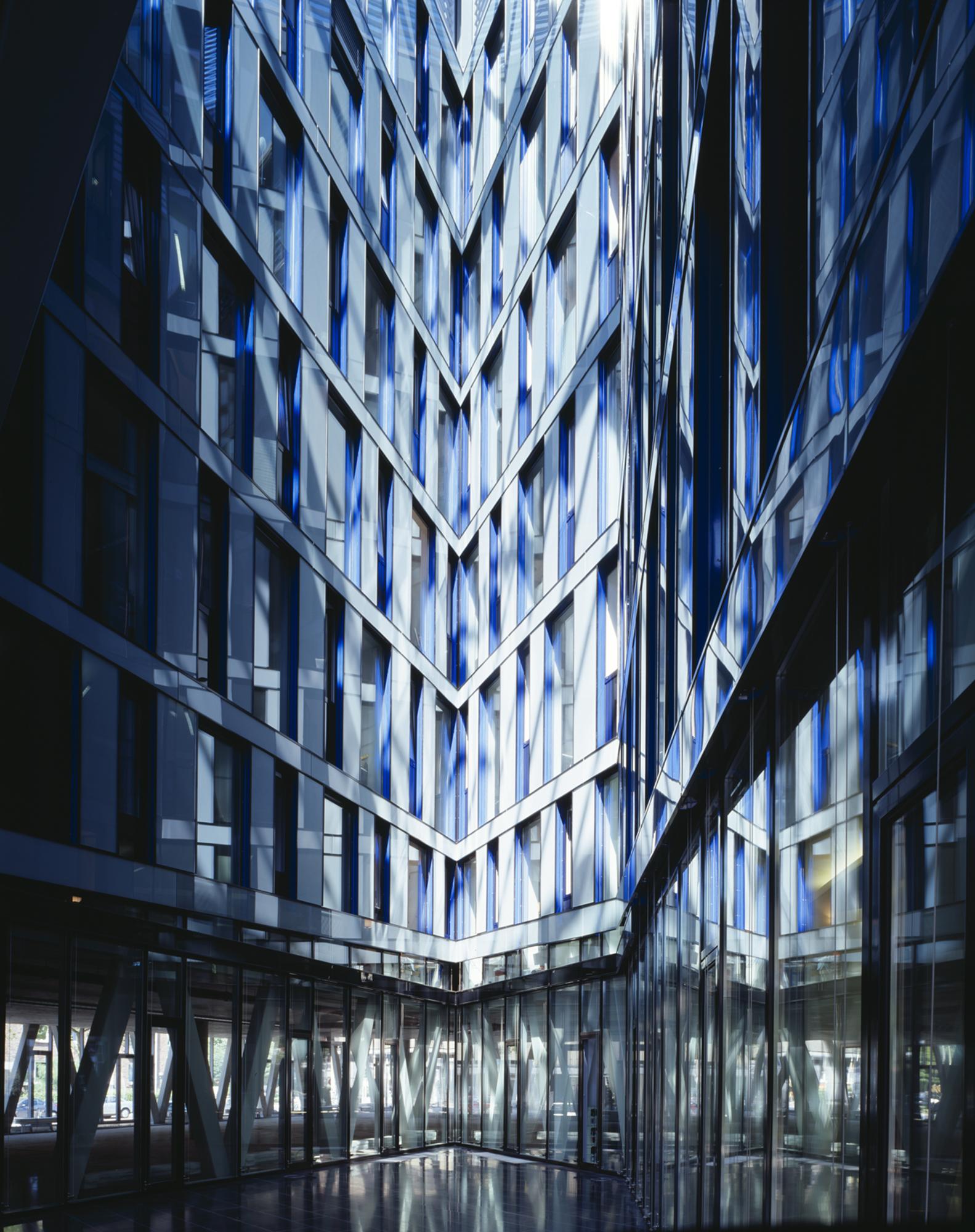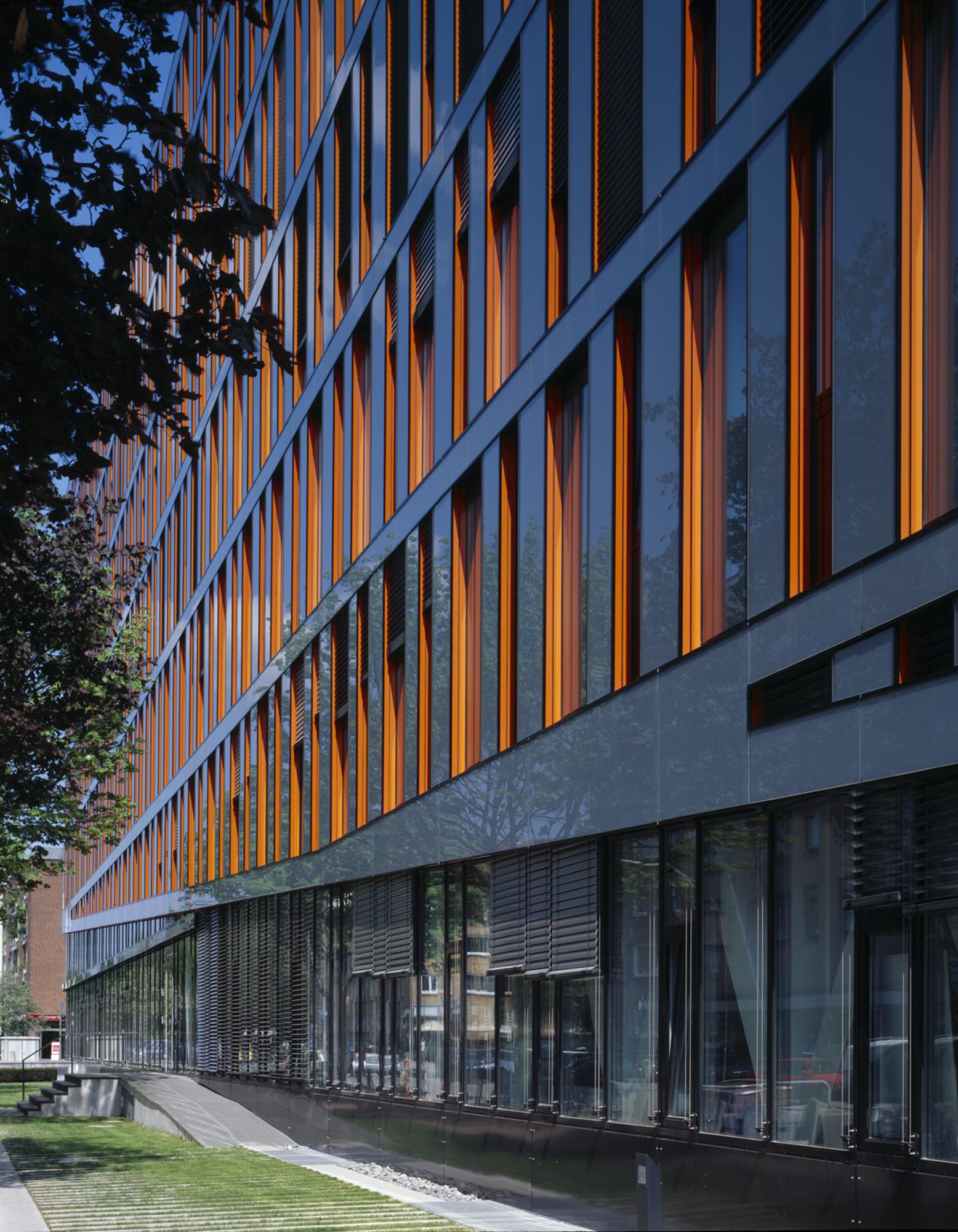 Die Hauptfassade besteht aus einem Muster aus geschossweise versetzten, fest verglasten und geschosshohen Fensterelementen. Die Fensterelemente sind individuell zu öffnen. Entsprechend der städteräumlich exponierten Situationen an der Kreuzung Poßmoorweg/Dorotheenstraße und im Eingangsbereich Moorfurthweg steigt der Baukörper um bis zu zwei Geschossen an und legt eine schräge und durchgehend verglaste untere ‚Sockelfassade’ frei. Die Hauptfassade besteht aus geschosshohen Fensterelementen – angeordnet zwischen Stahlbetonaußenstützen und den Geschossdecken – und einer Verkleidung der geschlossenen Fassadenbereiche aus emailliertem Glas sowie einer Unterkonstruktion und Wärmedämmung. Die untere ‚Sockelfassade’ umfasst die Bereiche des Erdgeschosses und des 1. OG unterhalb des schrägen Abschluss der Hauptfassade. Der Sonnenschutz besteht aus elektrisch betriebenen, außen liegenden Lamellenstores.