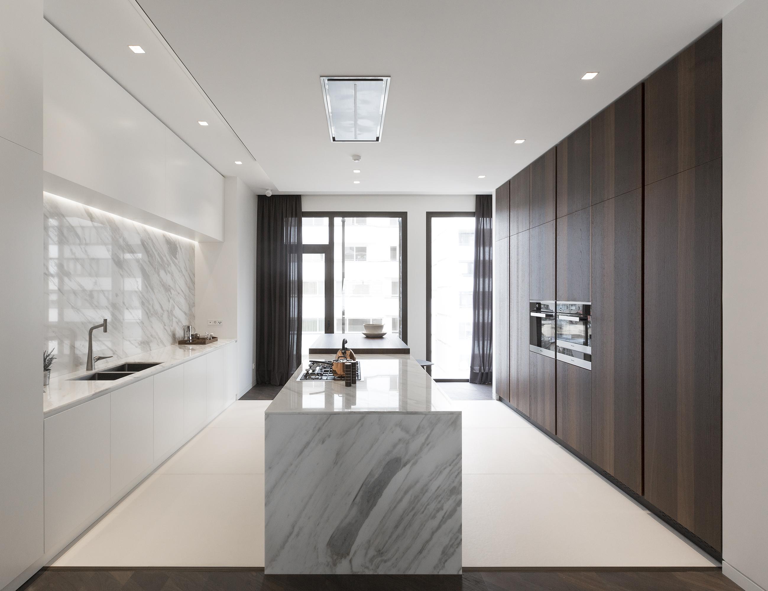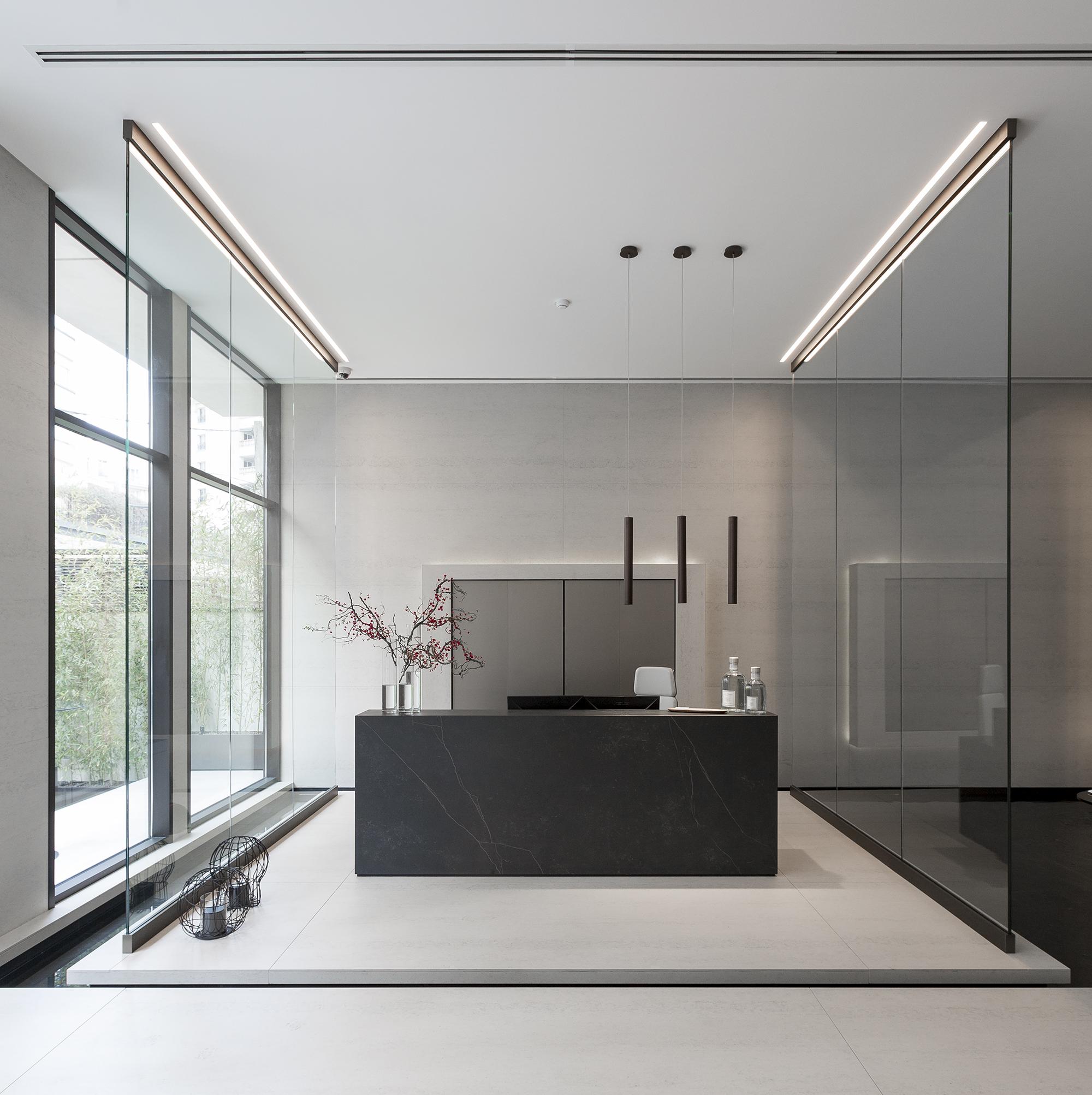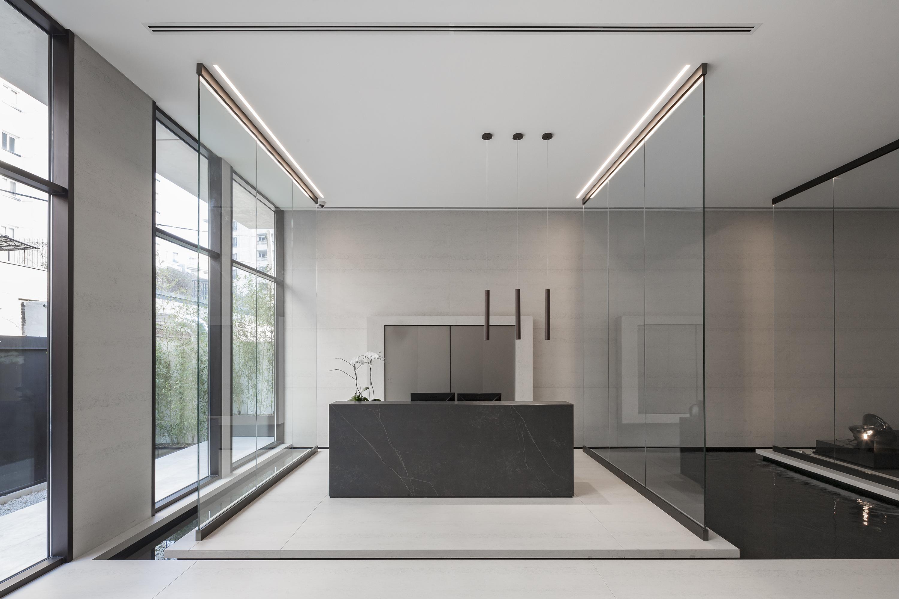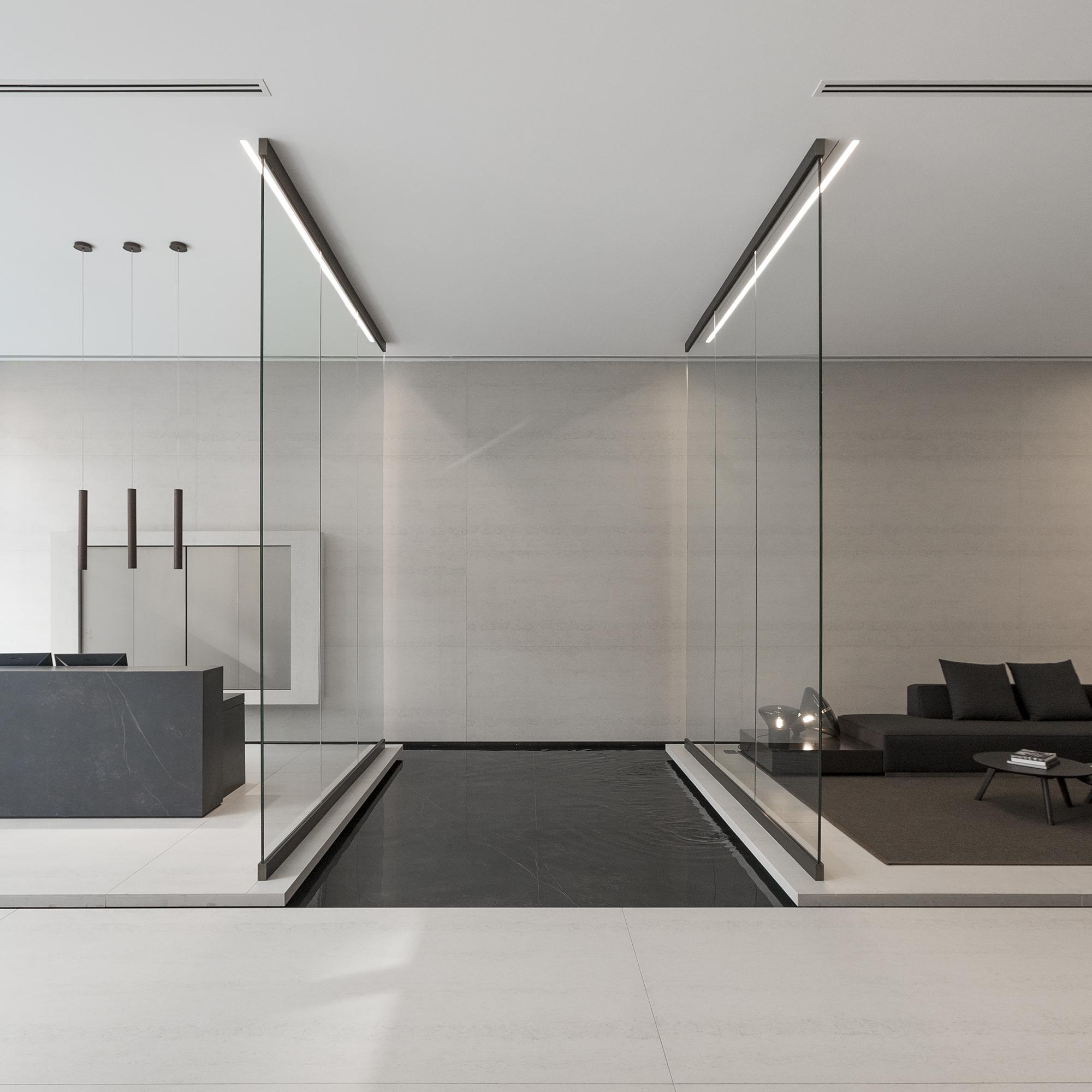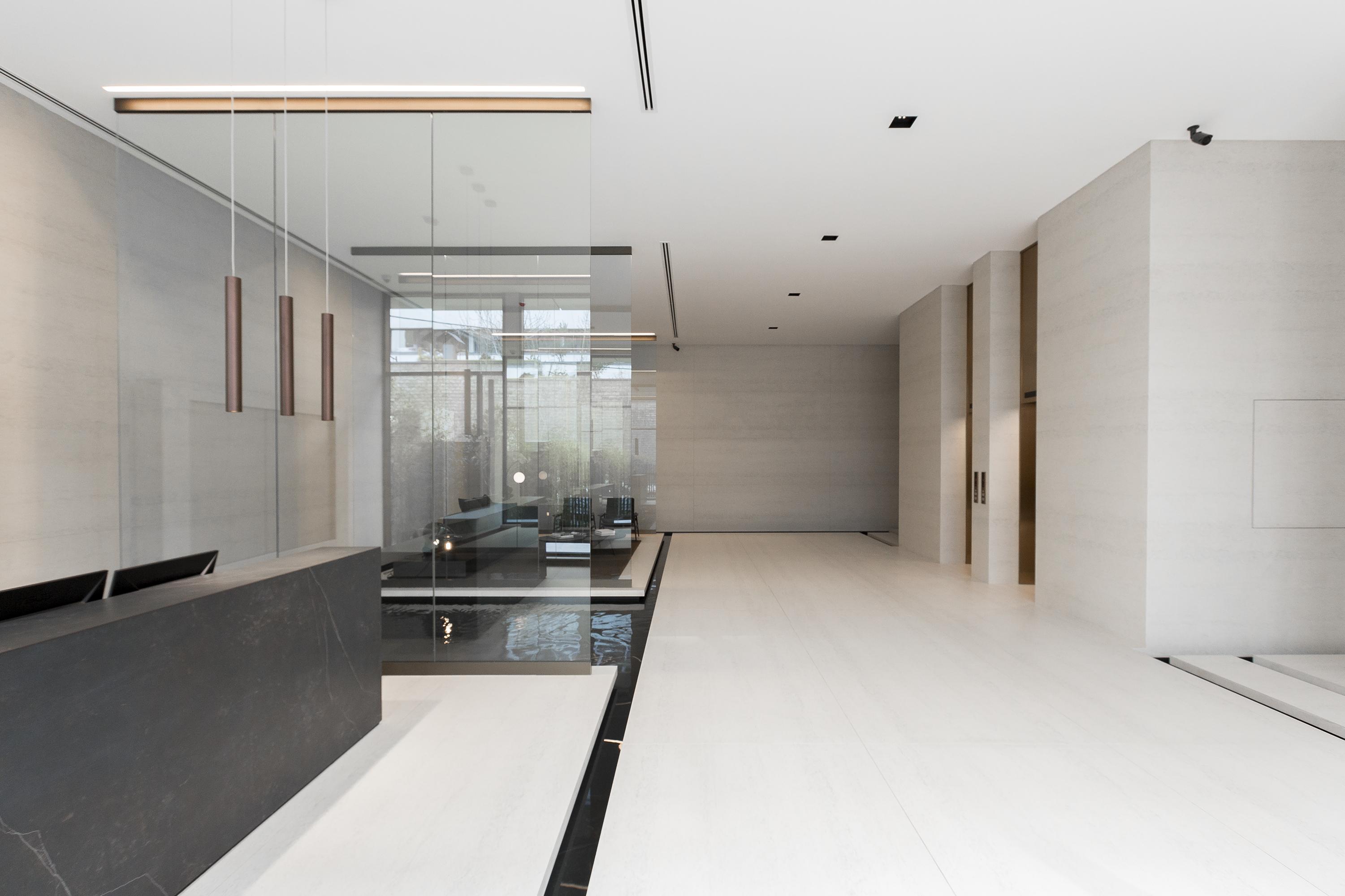 Im Inneren zeichnet es sich durch einen modernen und hochwertigen Innenausbau aus der ebenfalls aus der Feder von Hadi Teherani stammt: Architekten und Innenarchitekten haben Hand in Hand eine Wohnatmosphäre der Extraklasse entworfen. Das Erdgeschoss ist einer eleganten Lobby vorbehalten, deren gedeckte Farben und großzügige Wasserbecken absolute Ruhe ausstrahlen.