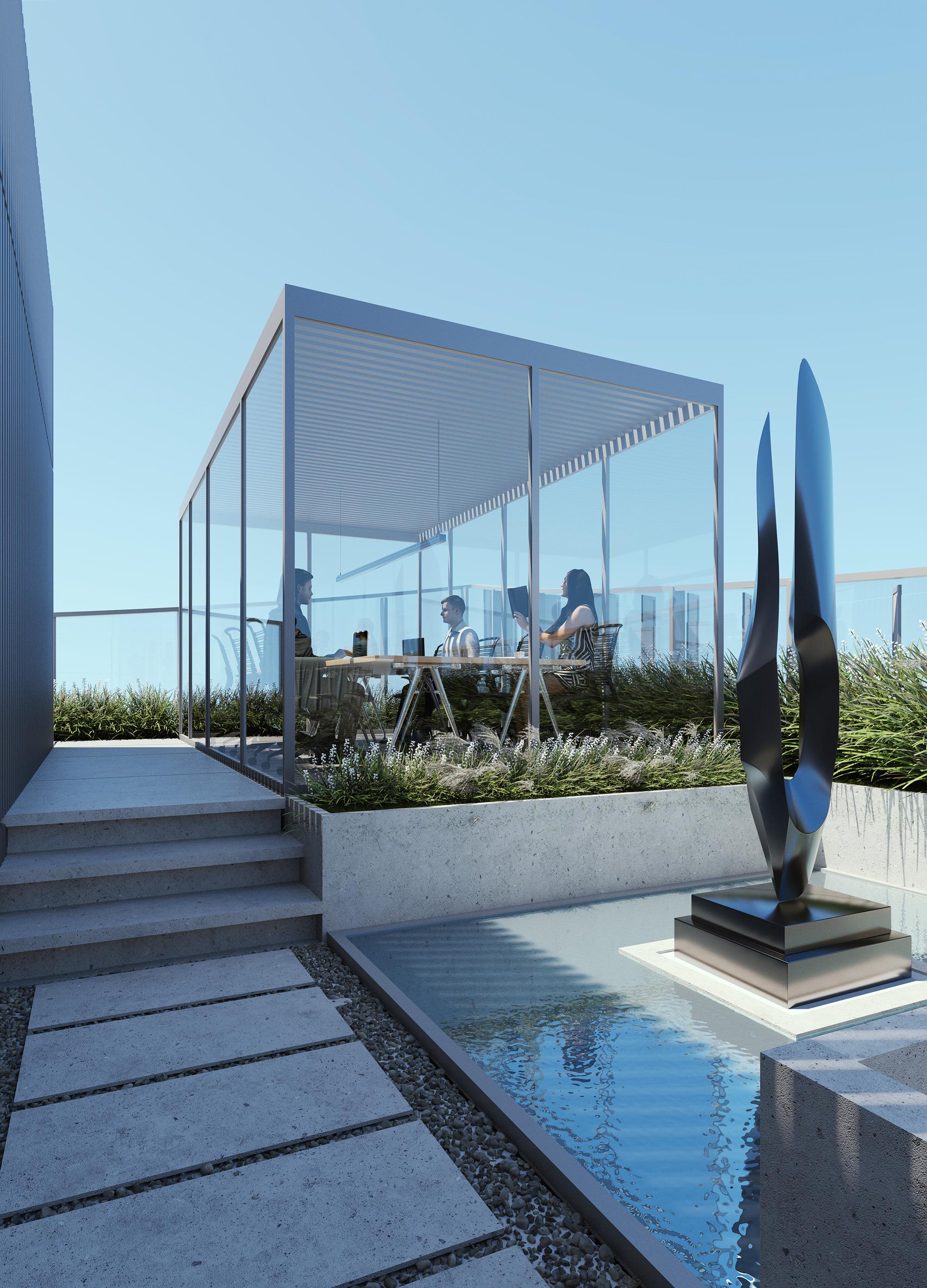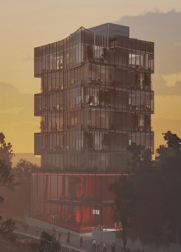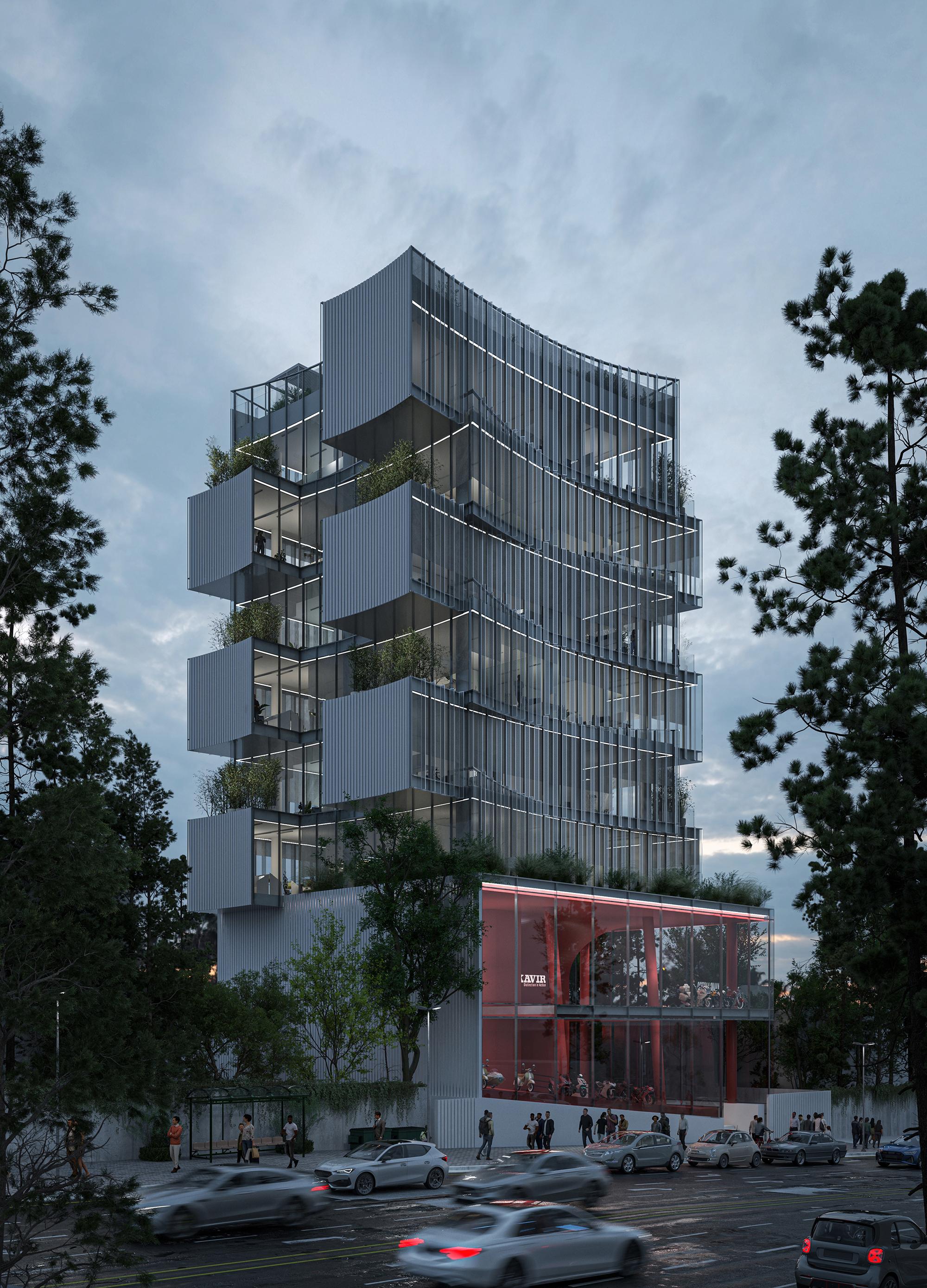 Das architektonische Erscheinungsbild ist geprägt von einer geschwungenen, vorgehängten Elementfassade mit integrierten Verschattungssystemen, die modernste Fassadentechnologie verkörpert. Die sanft gerundeten Gebäudekanten treten in Dialog mit den umliegenden Bäumen und verankern das Gebäude harmonisch in seiner Umgebung. Optimale Tageslichtführung, natürliche Belüftung und flexible Arbeitswelten schaffen ein zukunftsweisendes Bürogebäude, das in Teheran neue Maßstäbe setzt.