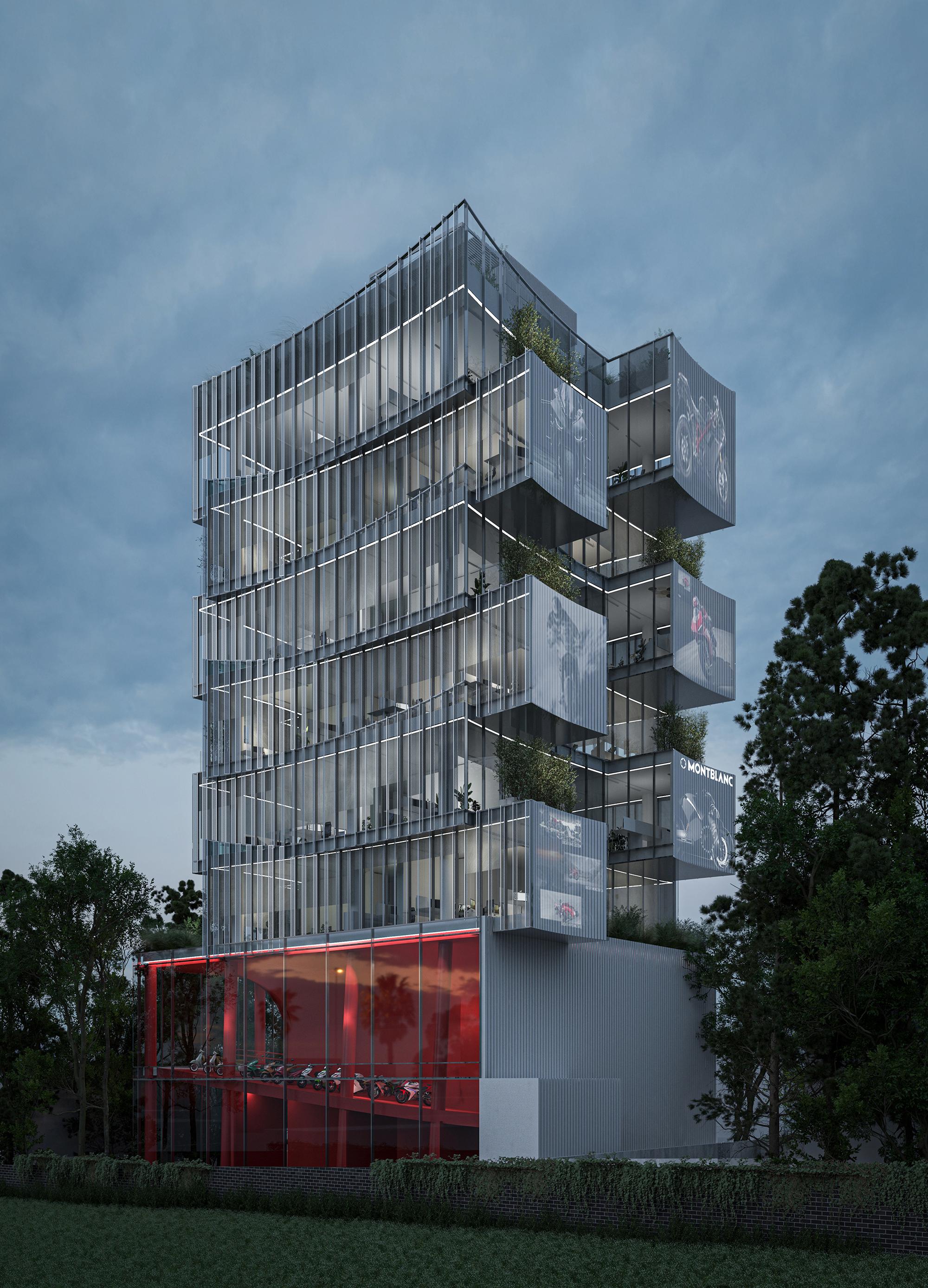 Auf einer Gesamtfläche von 7.830 Quadratmetern erhebt sich der sechsgeschossige Hauptsitz über einem doppelgeschossigen Showroom. Dieser ist als dynamische Rampe gestaltet, die die neuesten Modelle von Motorrädern und Scootern in einer fließenden räumlichen Inszenierung präsentiert. Neun Untergeschosse bieten Platz für 96 Stellplätze sowie technische und kommerzielle Einrichtungen, die eine effiziente Nutzung gewährleisten.