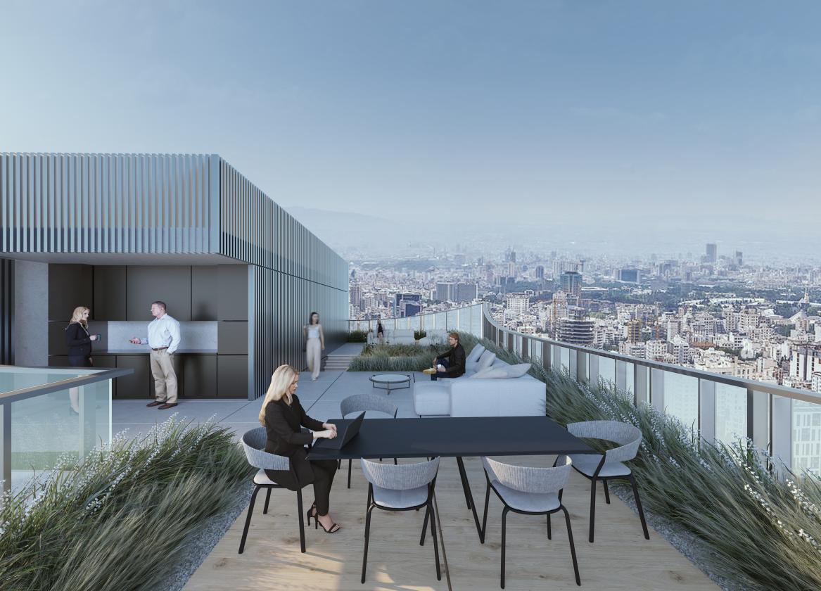 Ein besonderes Highlight bildet die multifunktionale Dachterrasse, die für Firmenveranstaltungen genutzt werden kann und beeindruckende Ausblicke auf die Bergkulisse im Norden Teherans eröffnet.