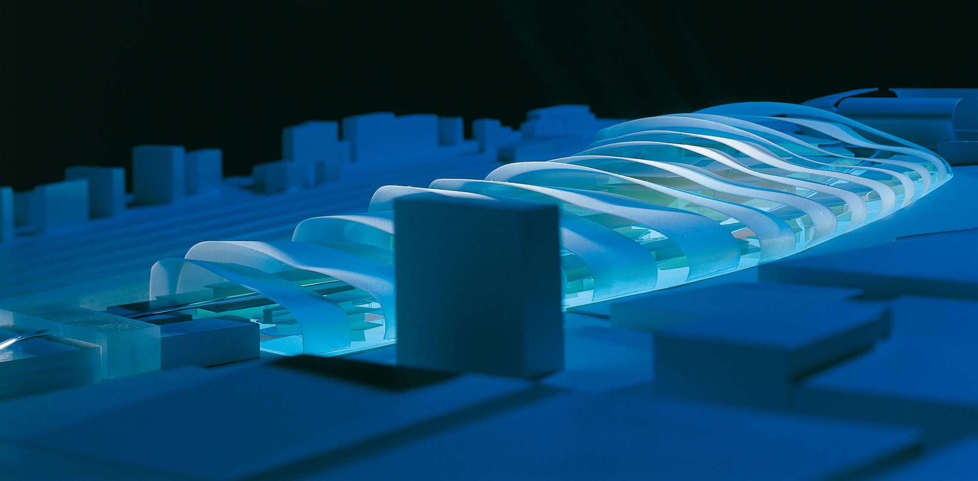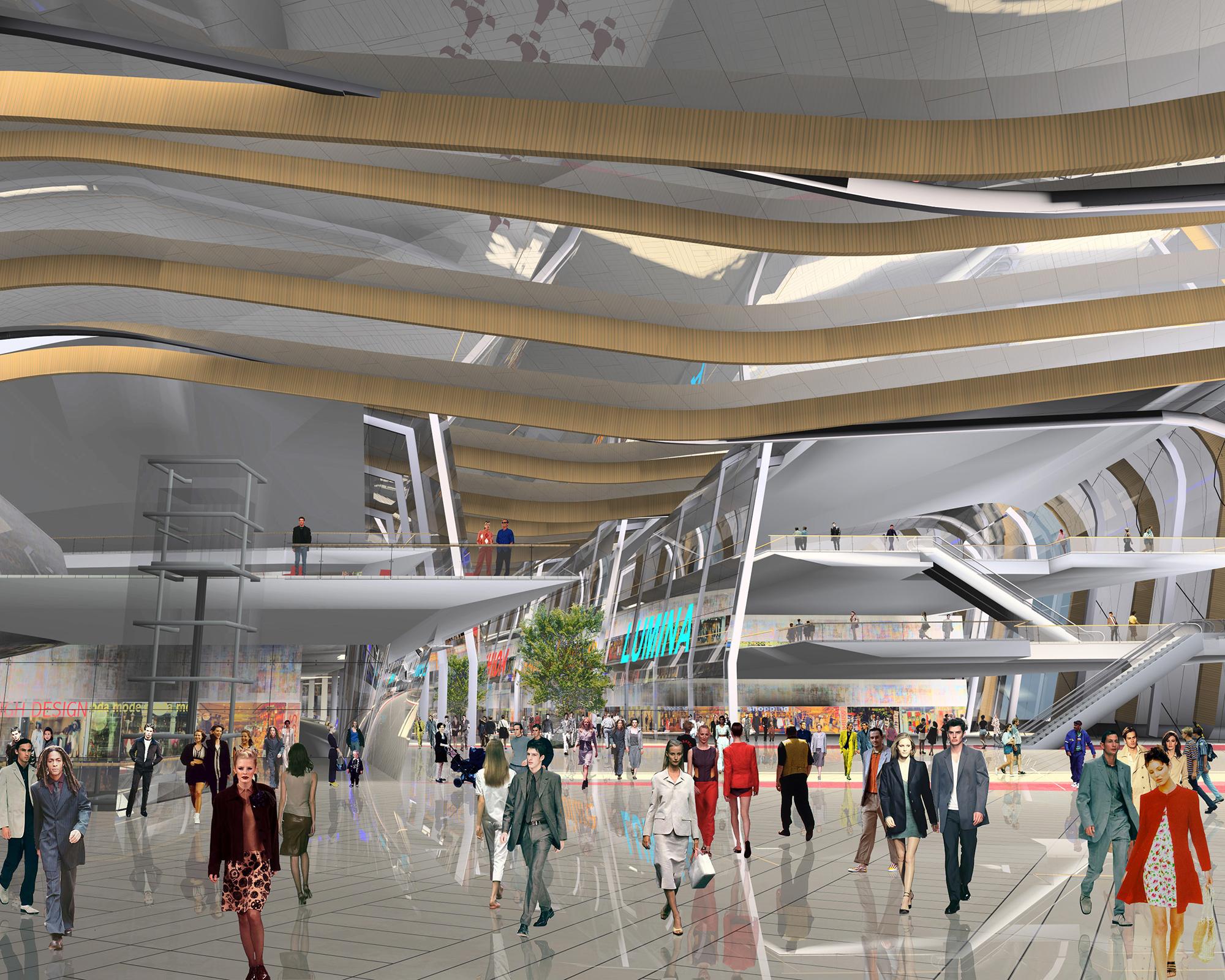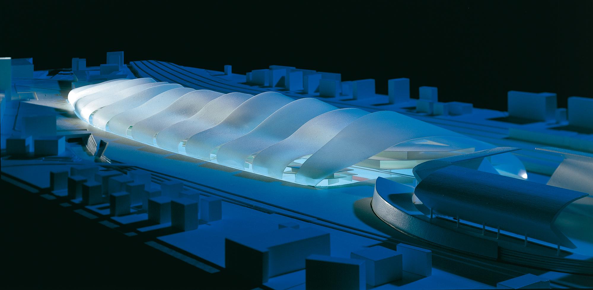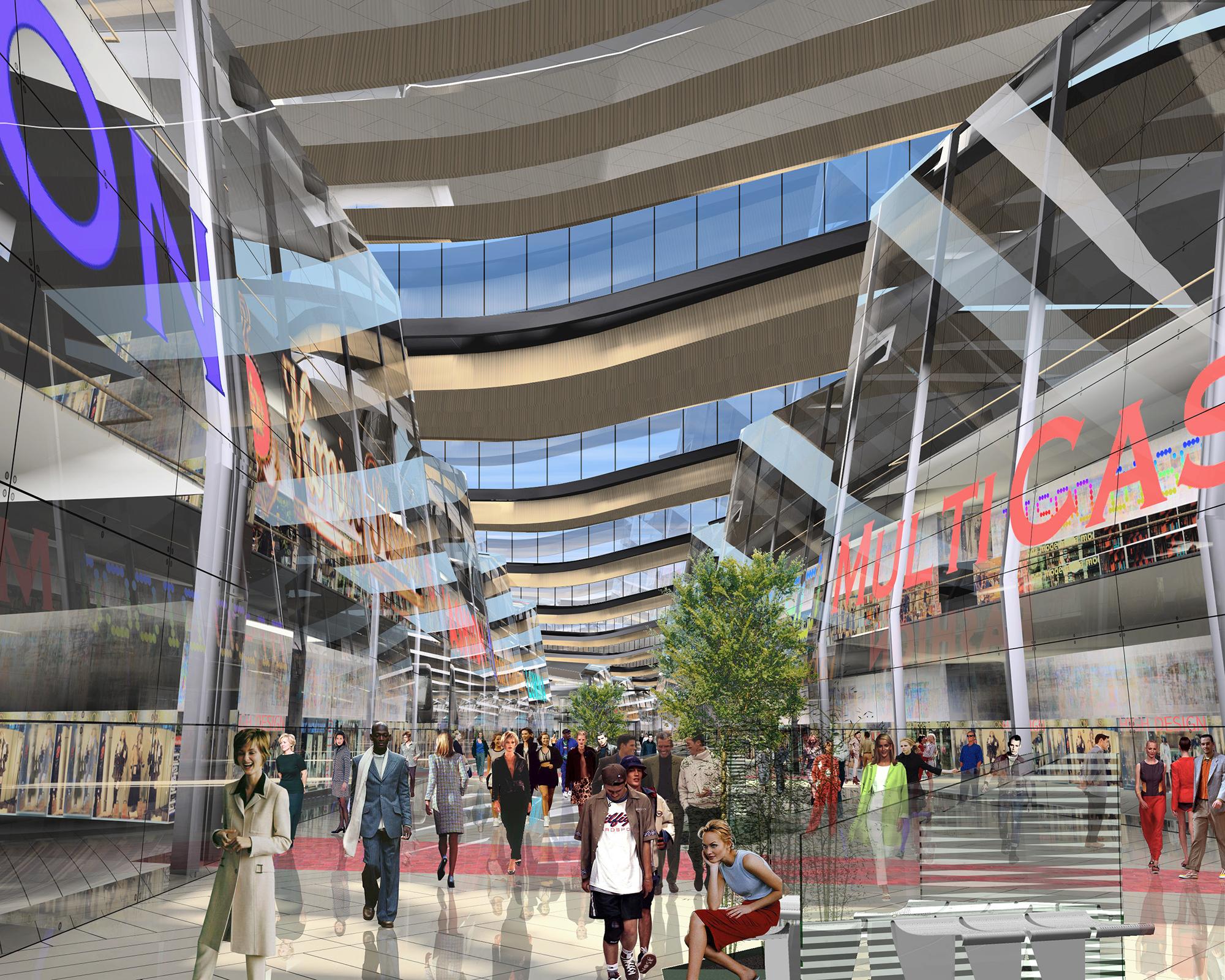 EinkaufszentrumDuisburg, DNoch ist der frühere Duisburger Güterbahnhof eine riesige Brachfläche. Doch in Zukunft könnte eine einzigartige Einkaufs- und Erlebniswelt das verwaiste Gebiet nahe dem Hauptbahnhof wiederbeleben: die Kultur- und Gewerbemeile Multi Casa. Leitgedanke des Entwurfs ist die räumliche Inszenierung einer stabilen und flexiblen Innenstadterweiterung. Geprägt wird das Gebäude von einer imposanten Außenkonstruktion: Wellenartige Metallschuppen hüllen den geschwungen verlaufenden Innenraum in loser Anordnung ein; die Zwischenräume füllen transparente Glasfassaden aus, die viel Licht hinein lassen. Einfache Betongeschossdecken ermöglichen im Inneren eine flexible Nutzung. Die oberen Etagen können später leicht erweitert werden. Eine wichtige Rolle bei der Entwicklung des Entwurfs spielte die Begrünung: Bepflanzungen an zahlreichen Orten der Multi Casa, die Parkgestaltung des Areals und die Grünoasen am Bahnhofsvorplatz schaffen eine angenehme Atmosphäre und geben der Innenstadt ein Stück Natürlichkeit zurück.