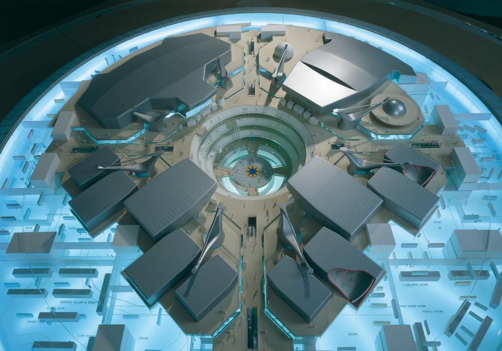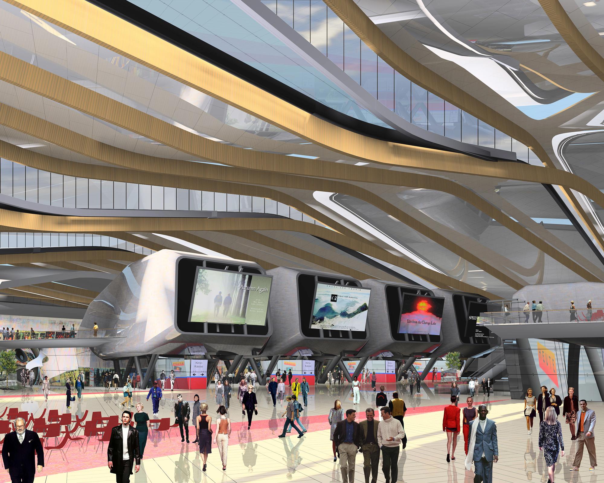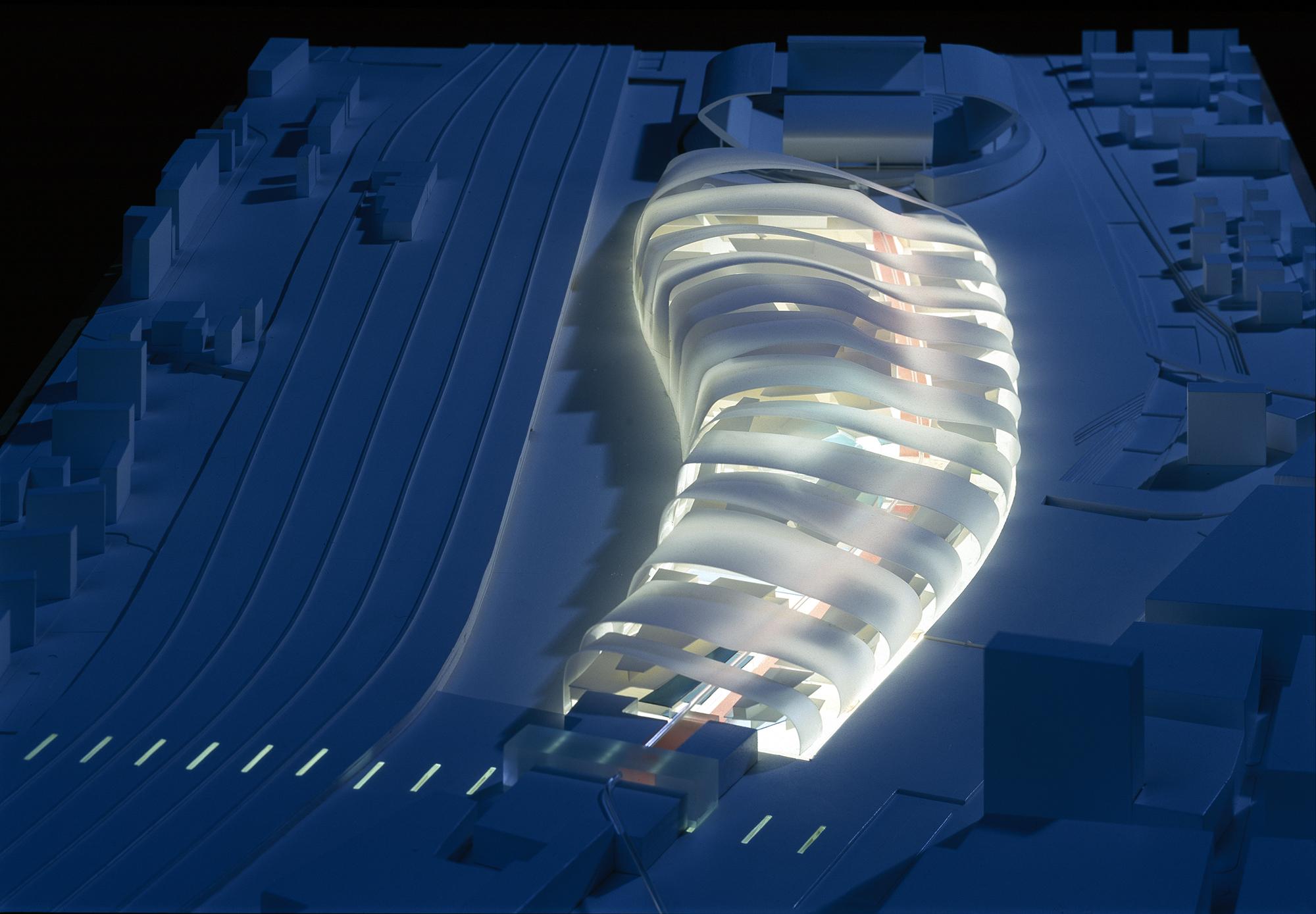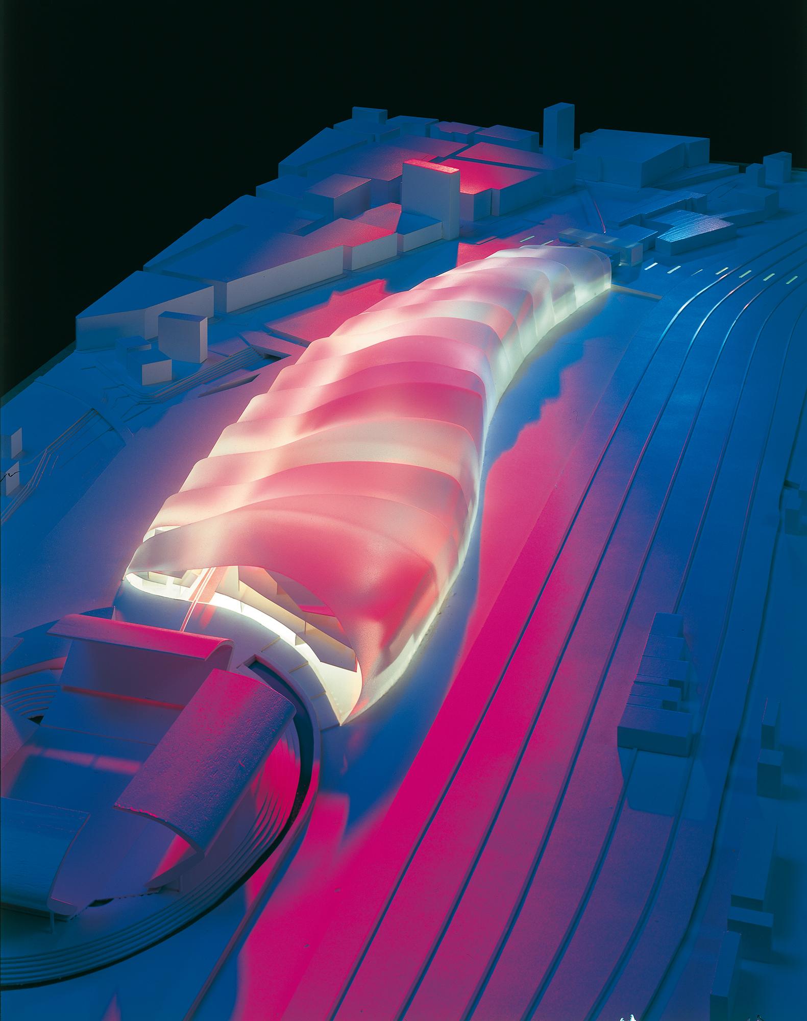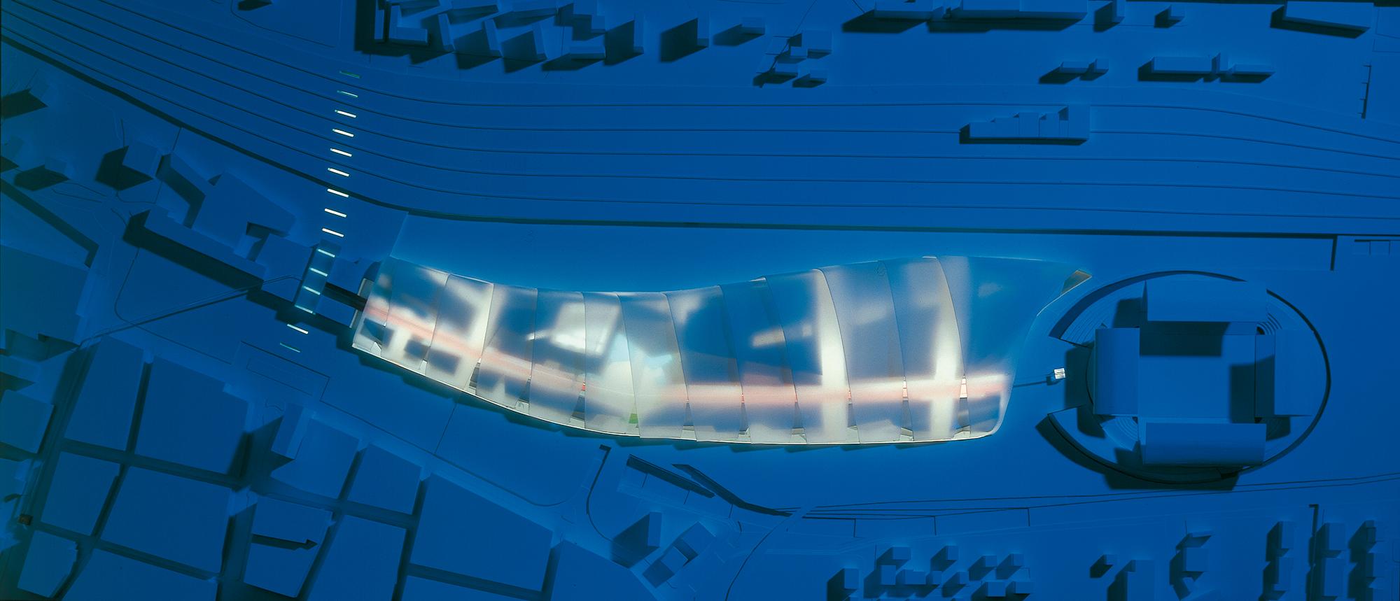 EinkaufszentrumDuisburg, DNoch ist der frühere Duisburger Güterbahnhof eine riesige Brachfläche. Doch in Zukunft könnte eine einzigartige Einkaufs- und Erlebniswelt das verwaiste Gebiet nahe dem Hauptbahnhof wiederbeleben: die Kultur- und Gewerbemeile Multi Casa. Leitgedanke des Entwurfs ist die räumliche Inszenierung einer stabilen und flexiblen Innenstadterweiterung. Geprägt wird das Gebäude von einer imposanten Außenkonstruktion: Wellenartige Metallschuppen hüllen den geschwungen verlaufenden Innenraum in loser Anordnung ein; die Zwischenräume füllen transparente Glasfassaden aus, die viel Licht hinein lassen. Einfache Betongeschossdecken ermöglichen im Inneren eine flexible Nutzung. Die oberen Etagen können später leicht erweitert werden. Eine wichtige Rolle bei der Entwicklung des Entwurfs spielte die Begrünung: Bepflanzungen an zahlreichen Orten der Multi Casa, die Parkgestaltung des Areals und die Grünoasen am Bahnhofsvorplatz schaffen eine angenehme Atmosphäre und geben der Innenstadt ein Stück Natürlichkeit zurück.