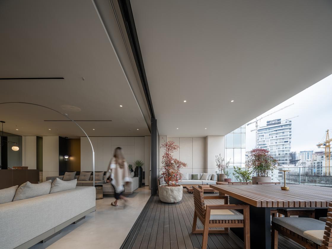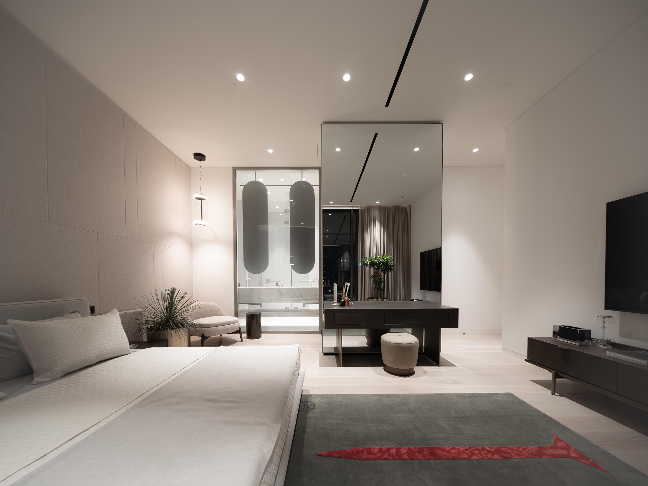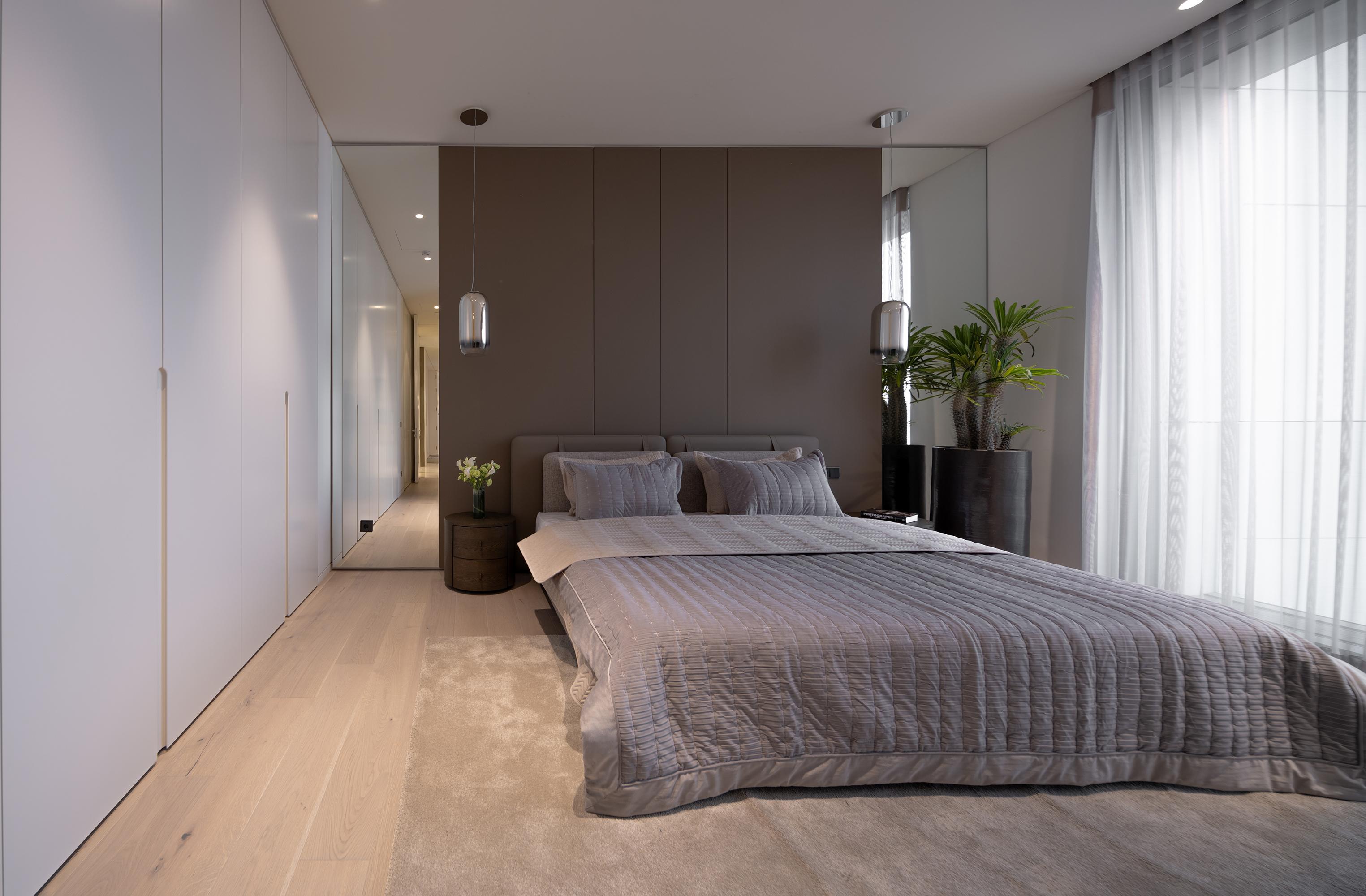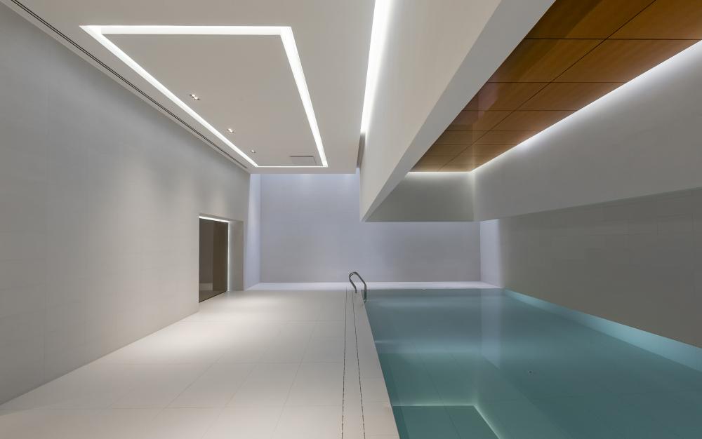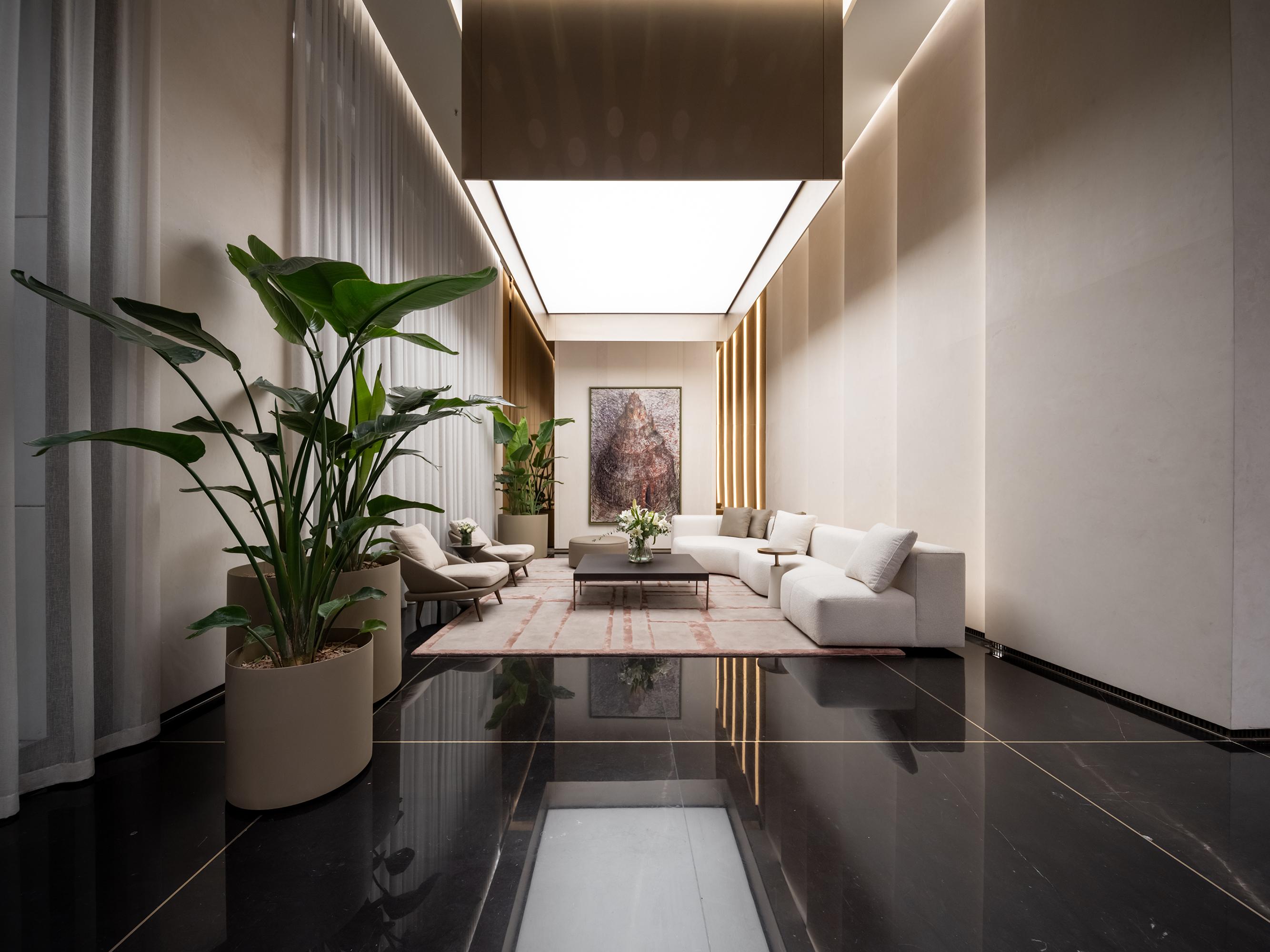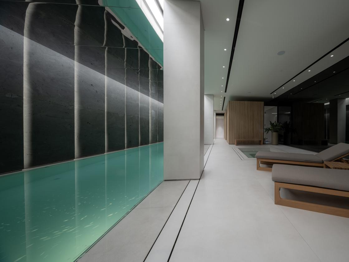 Die daraus resultierende Großzügigkeit, die durch die Außengestaltung noch verstärkt wird, dokumentiert jede einzelne Wohneinheit: 3- und 4-Zimmer-Wohnungen sowie eine Suite und darüber das Penthouse mit großen Dachterrassen. Im Innenbereich ist eine moderne und betont hochwertige Innenraumgestaltung das prägende Element. Auch hier ist Hadi Teherani der prägende Mann. Hand in Hand haben Architekten und Innenarchitekten eine hochkarätige Wohnatmosphäre geschaffen. Das Erdgeschoss ist einer luxuriösen Lobby vorbehalten, die mit ihren gedeckten Farben und dem großzügig angelegten Sitzbereich und Konferenzraum absolute Ruhe ausstrahlt. Die 11 Wohneinheiten (445 m²) haben Zugang zu einer exklusiven Auswahl an Sonderausstattungen, darunter ein 17 Meter langes Schwimmbad, zwei Saunen, Massageräume, ein Fitnessstudio, ein privater Veranstaltungssaal, 51 Parkplätze, eine Autowaschanlage und eine private, individuelle Liftlobby.