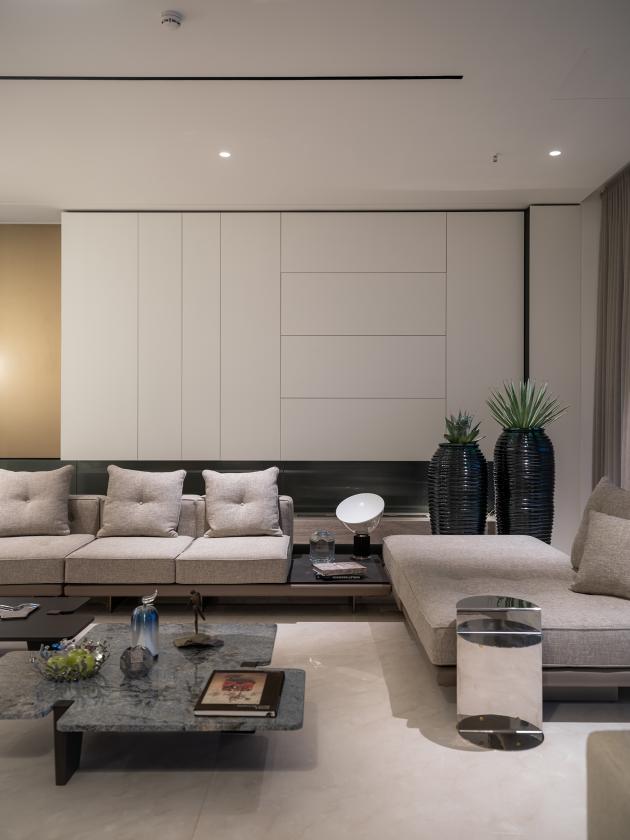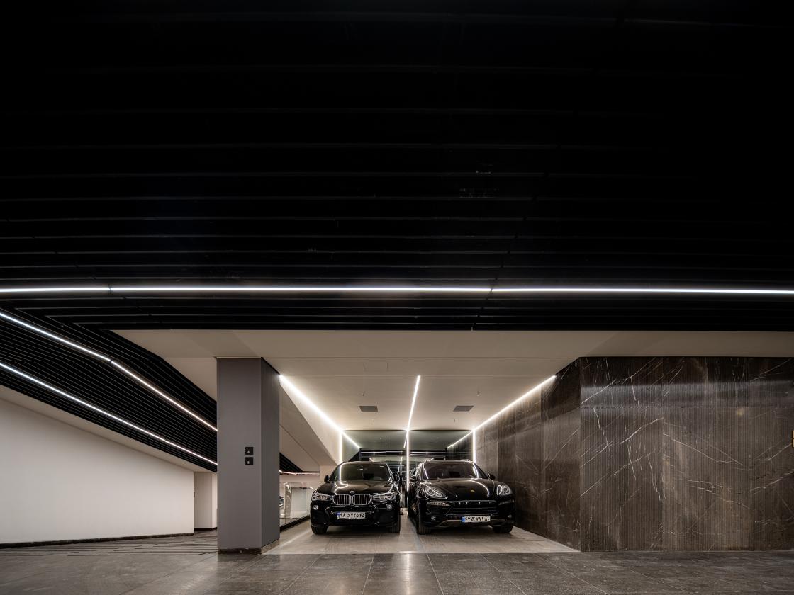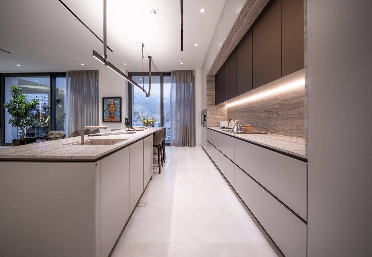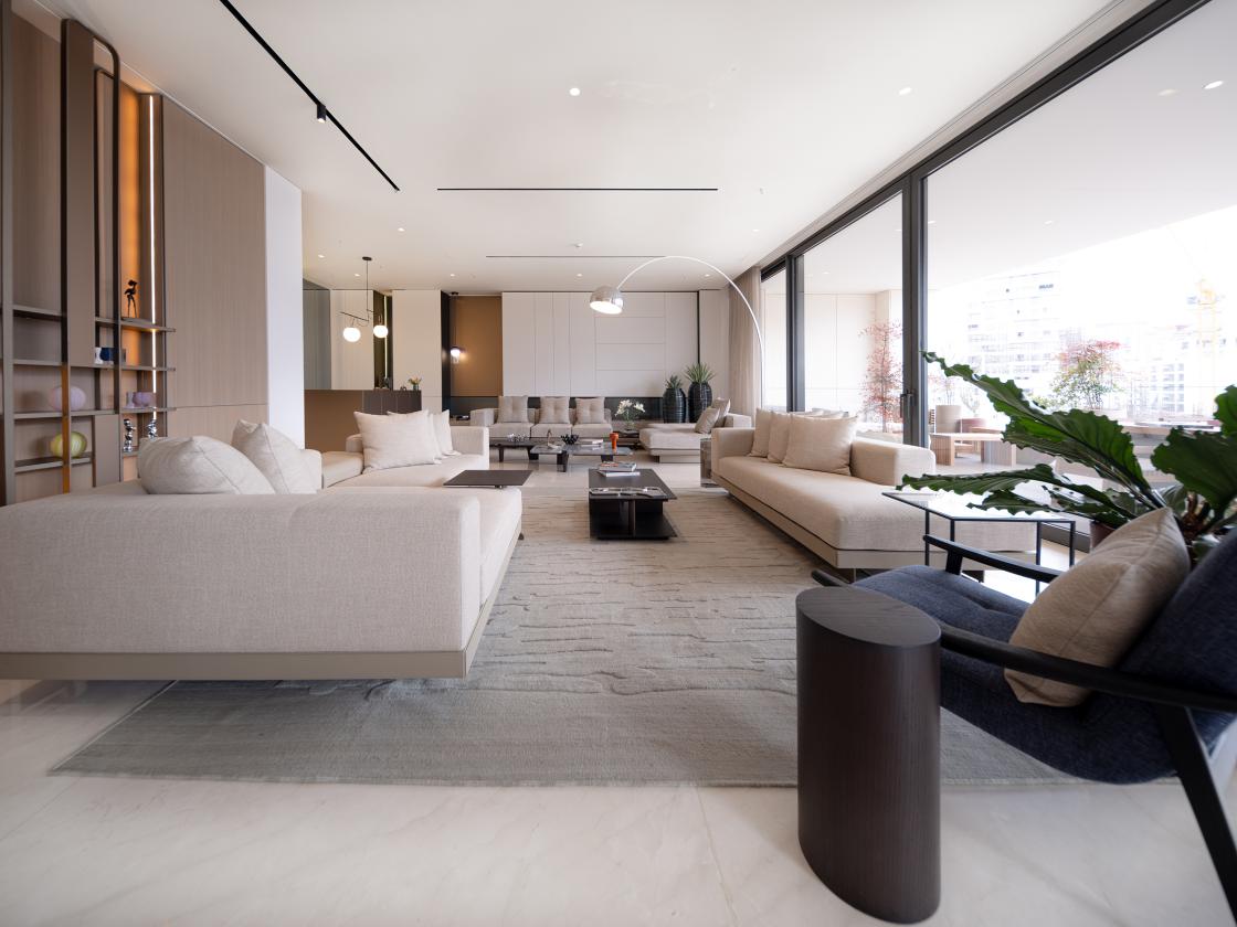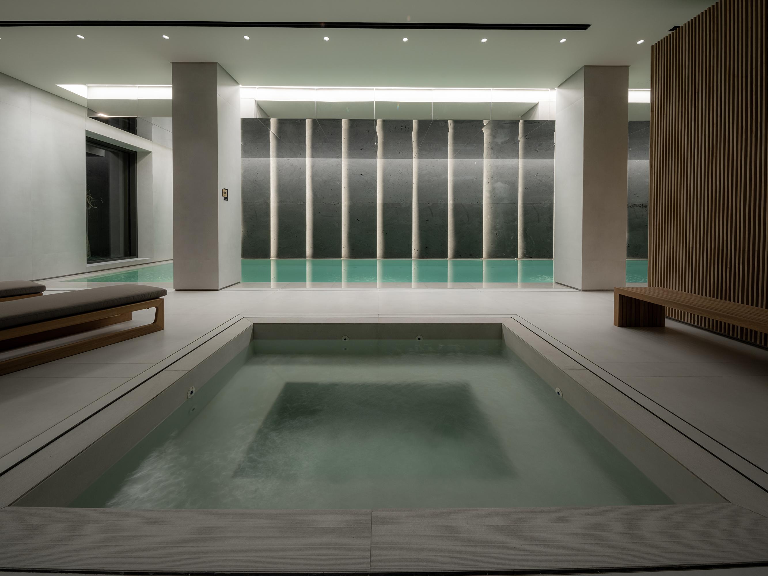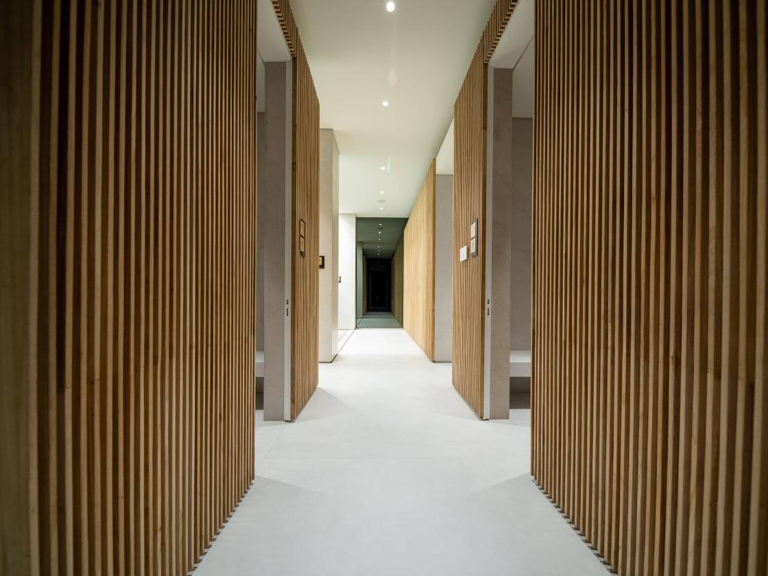 Die daraus resultierende Großzügigkeit, die durch die Außengestaltung noch verstärkt wird, dokumentiert jede einzelne Wohneinheit: 3- und 4-Zimmer-Wohnungen sowie eine Suite und darüber das Penthouse mit großen Dachterrassen. Im Innenbereich ist eine moderne und betont hochwertige Innenraumgestaltung das prägende Element. Auch hier ist Hadi Teherani der prägende Mann. Hand in Hand haben Architekten und Innenarchitekten eine hochkarätige Wohnatmosphäre geschaffen. Das Erdgeschoss ist einer luxuriösen Lobby vorbehalten, die mit ihren gedeckten Farben und dem großzügig angelegten Sitzbereich und Konferenzraum absolute Ruhe ausstrahlt. Die 11 Wohneinheiten (445 m²) haben Zugang zu einer exklusiven Auswahl an Sonderausstattungen, darunter ein 17 Meter langes Schwimmbad, zwei Saunen, Massageräume, ein Fitnessstudio, ein privater Veranstaltungssaal, 51 Parkplätze, eine Autowaschanlage und eine private, individuelle Liftlobby.