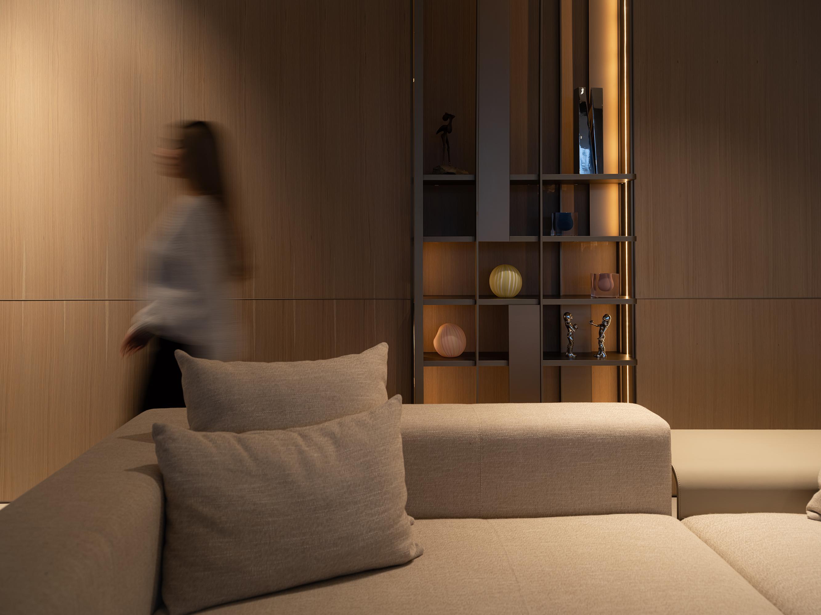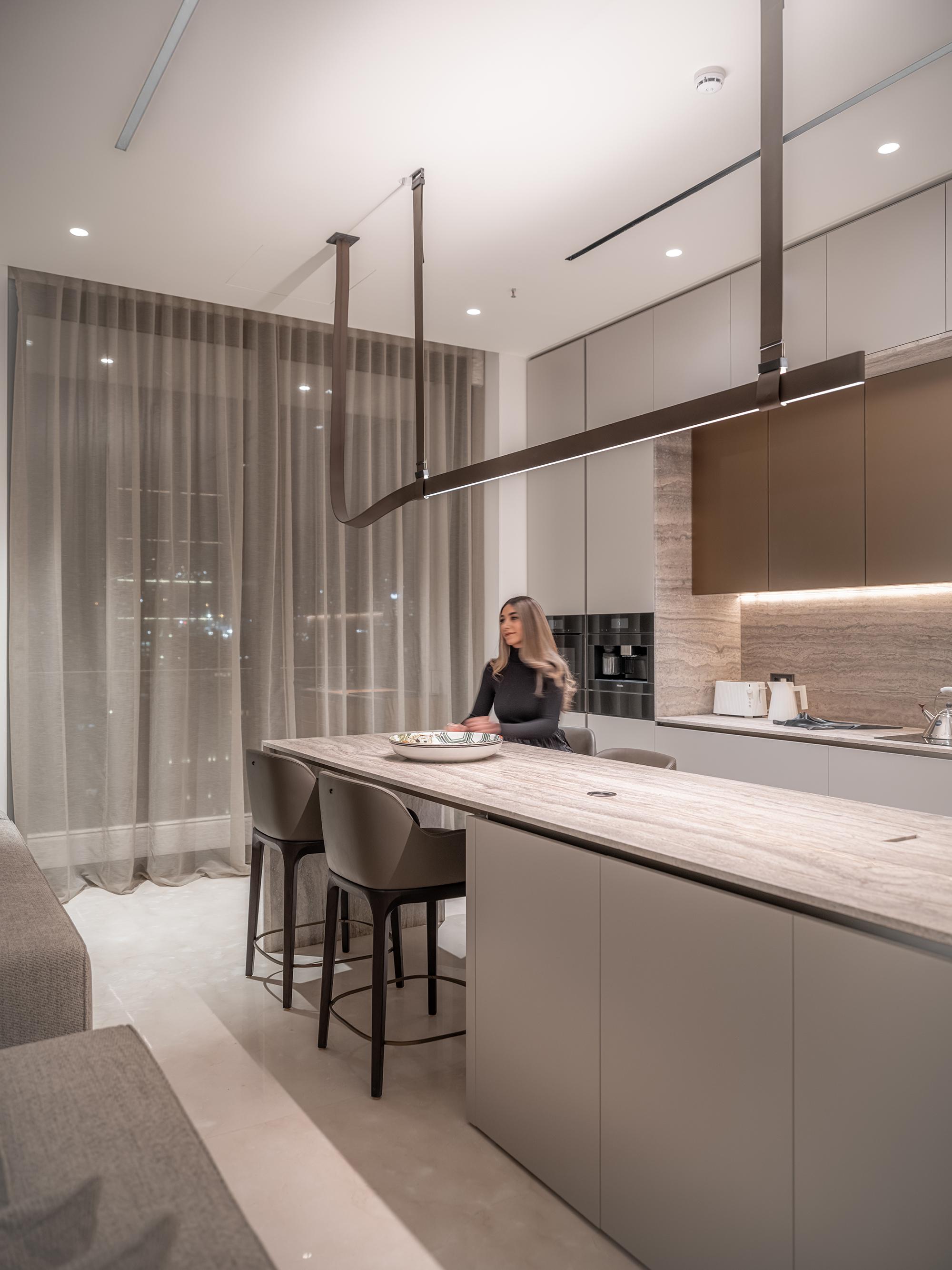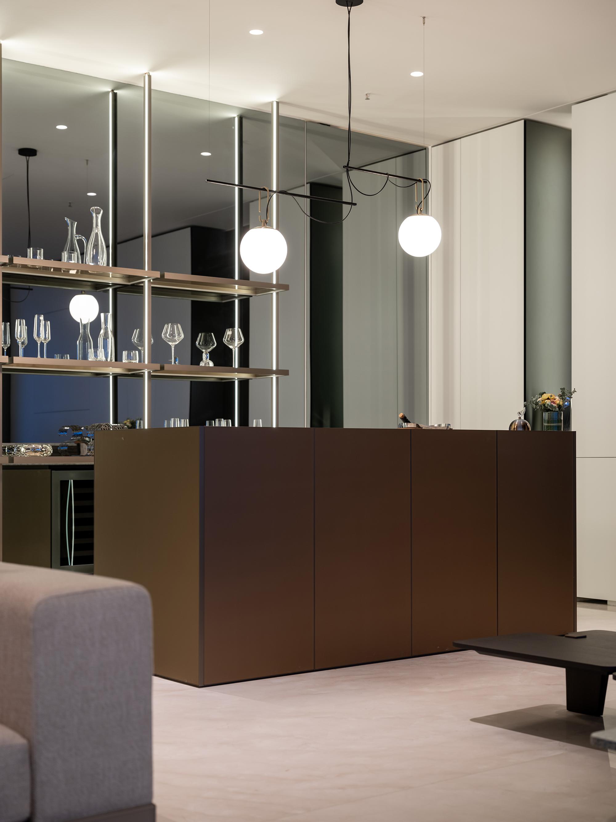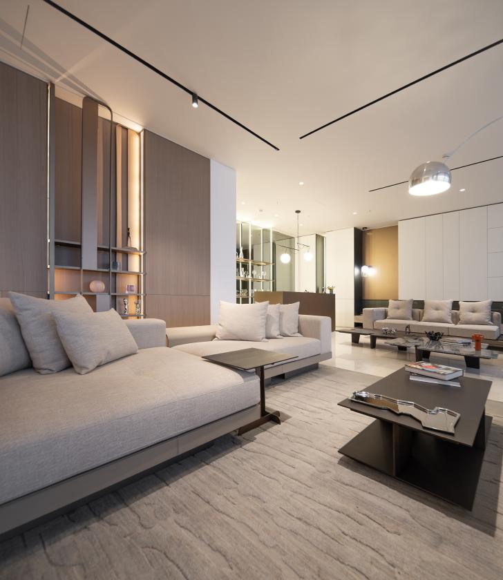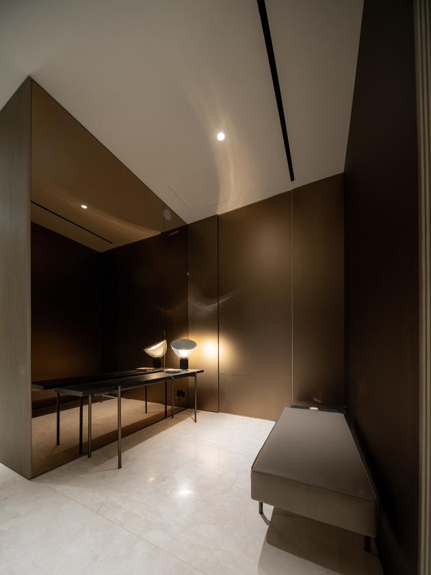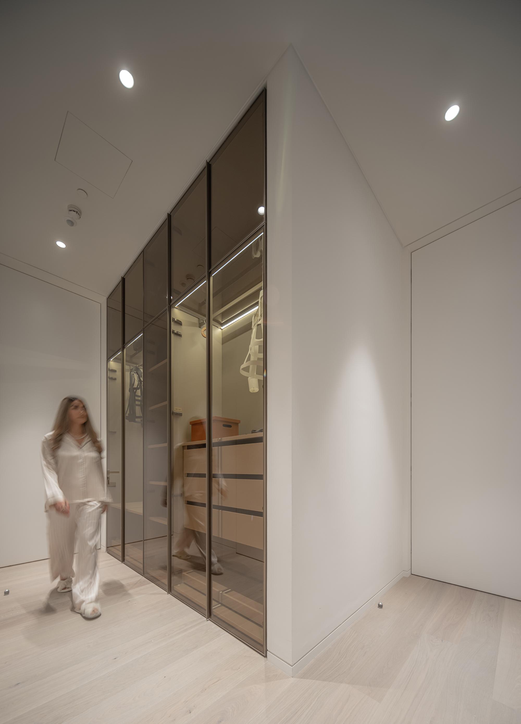 Die daraus resultierende Großzügigkeit, die durch die Außengestaltung noch verstärkt wird, dokumentiert jede einzelne Wohneinheit: 3- und 4-Zimmer-Wohnungen sowie eine Suite und darüber das Penthouse mit großen Dachterrassen. Im Innenbereich ist eine moderne und betont hochwertige Innenraumgestaltung das prägende Element. Auch hier ist Hadi Teherani der prägende Mann. Hand in Hand haben Architekten und Innenarchitekten eine hochkarätige Wohnatmosphäre geschaffen. Das Erdgeschoss ist einer luxuriösen Lobby vorbehalten, die mit ihren gedeckten Farben und dem großzügig angelegten Sitzbereich und Konferenzraum absolute Ruhe ausstrahlt. Die 11 Wohneinheiten (445 m²) haben Zugang zu einer exklusiven Auswahl an Sonderausstattungen, darunter ein 17 Meter langes Schwimmbad, zwei Saunen, Massageräume, ein Fitnessstudio, ein privater Veranstaltungssaal, 51 Parkplätze, eine Autowaschanlage und eine private, individuelle Liftlobby.