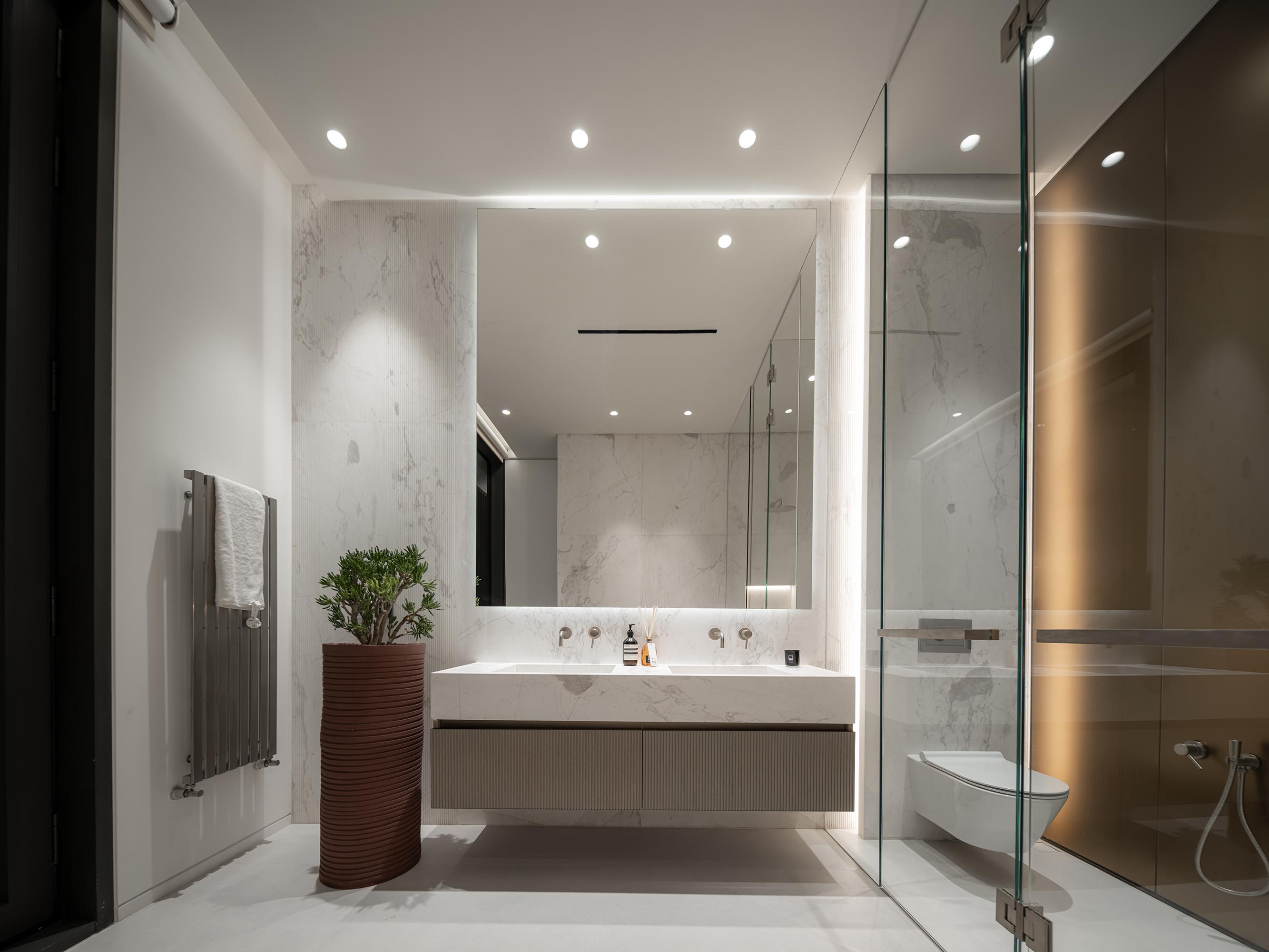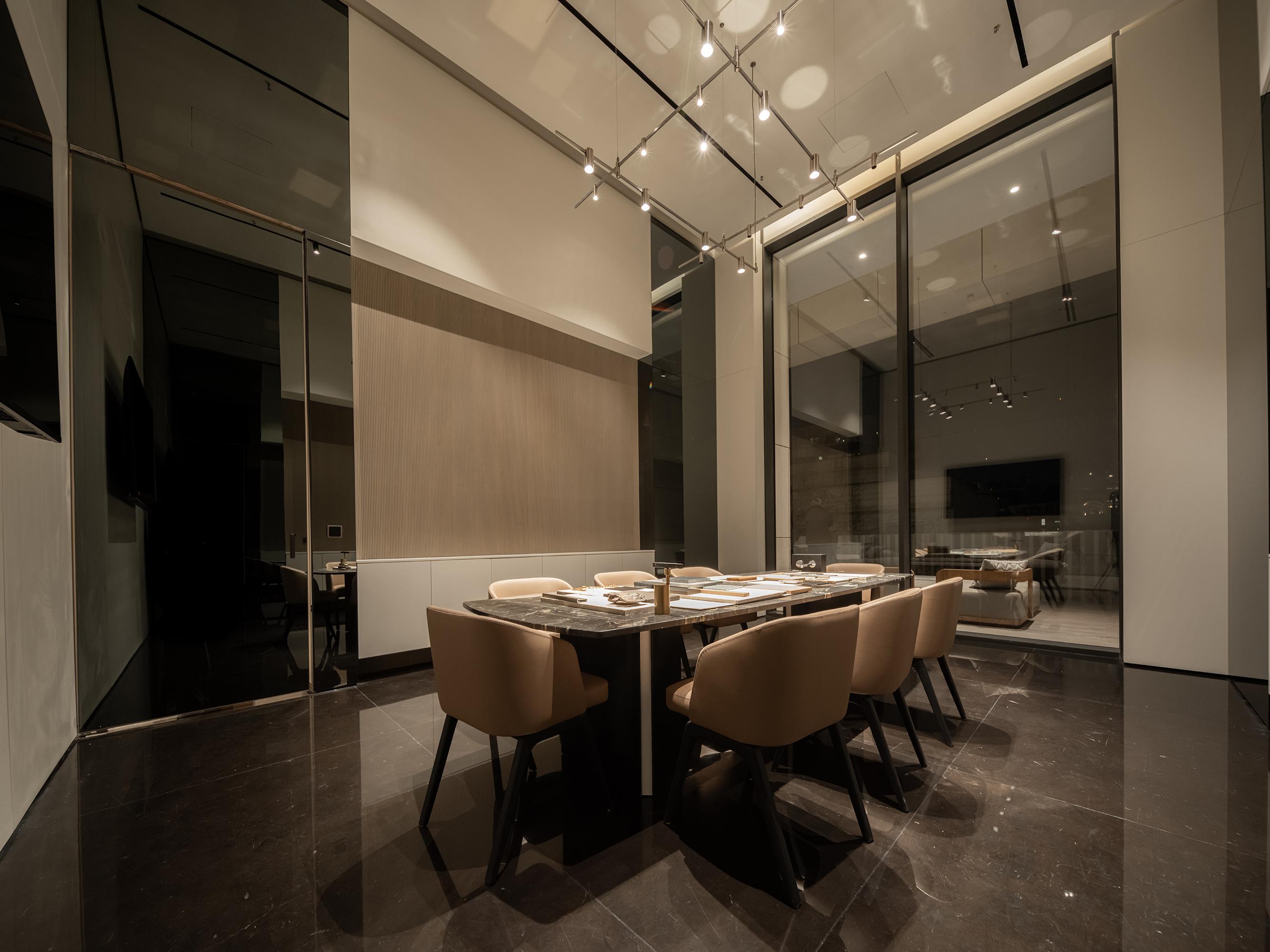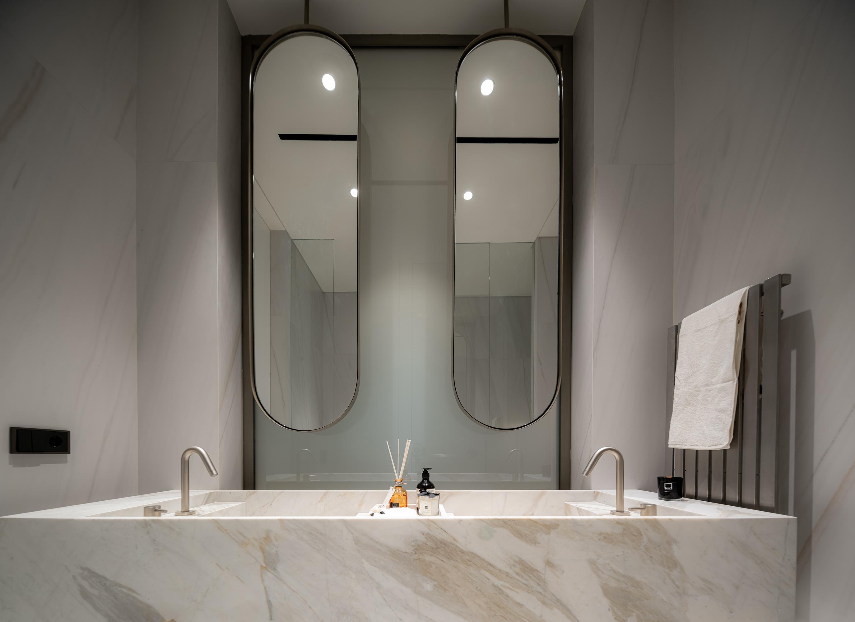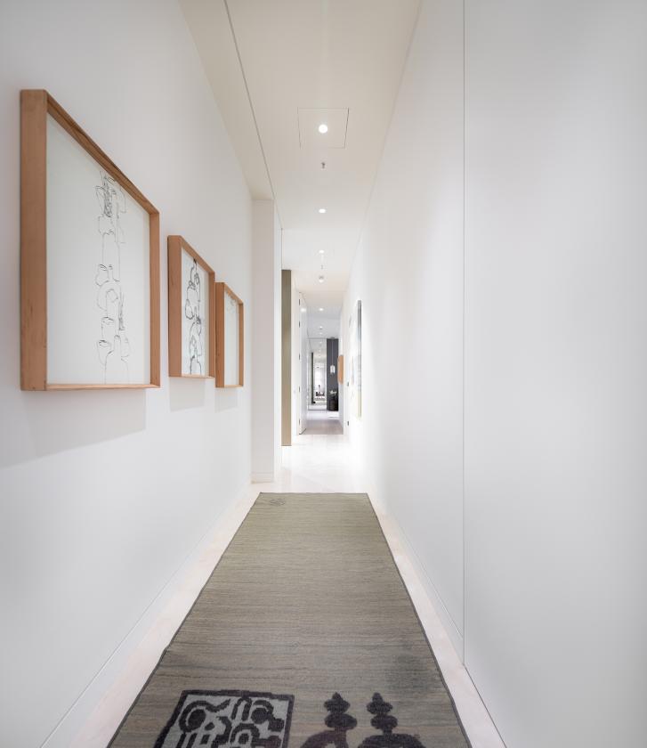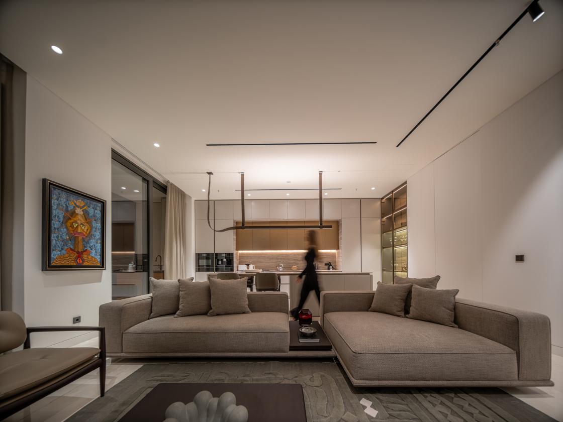 Die daraus resultierende Großzügigkeit, die durch die Außengestaltung noch verstärkt wird, dokumentiert jede einzelne Wohneinheit: 3- und 4-Zimmer-Wohnungen sowie eine Suite und darüber das Penthouse mit großen Dachterrassen. Im Innenbereich ist eine moderne und betont hochwertige Innenraumgestaltung das prägende Element. Auch hier ist Hadi Teherani der prägende Mann. Hand in Hand haben Architekten und Innenarchitekten eine hochkarätige Wohnatmosphäre geschaffen. Das Erdgeschoss ist einer luxuriösen Lobby vorbehalten, die mit ihren gedeckten Farben und dem großzügig angelegten Sitzbereich und Konferenzraum absolute Ruhe ausstrahlt. Die 11 Wohneinheiten (445 m²) haben Zugang zu einer exklusiven Auswahl an Sonderausstattungen, darunter ein 17 Meter langes Schwimmbad, zwei Saunen, Massageräume, ein Fitnessstudio, ein privater Veranstaltungssaal, 51 Parkplätze, eine Autowaschanlage und eine private, individuelle Liftlobby.