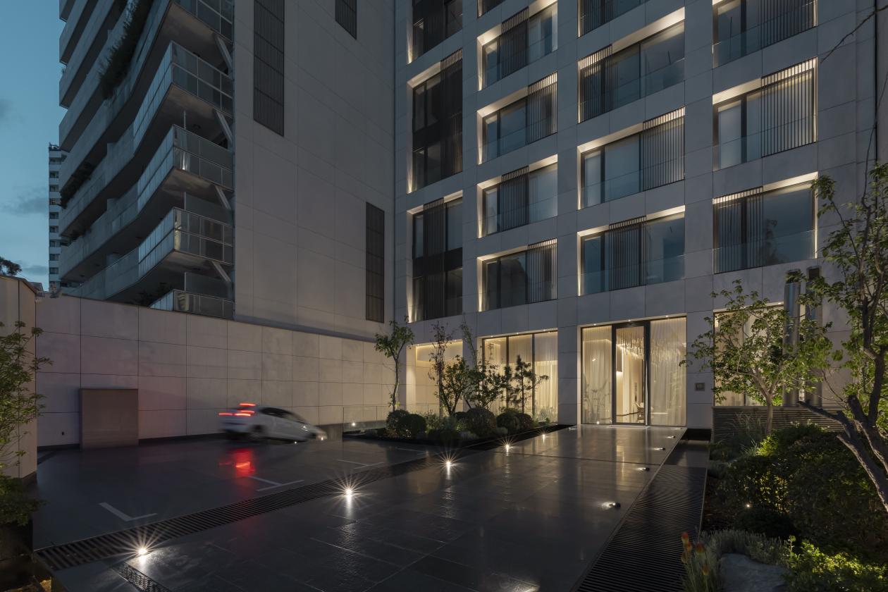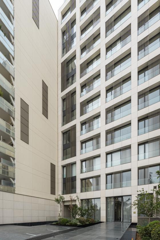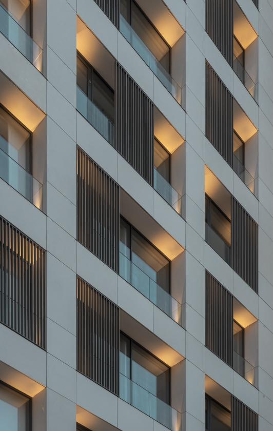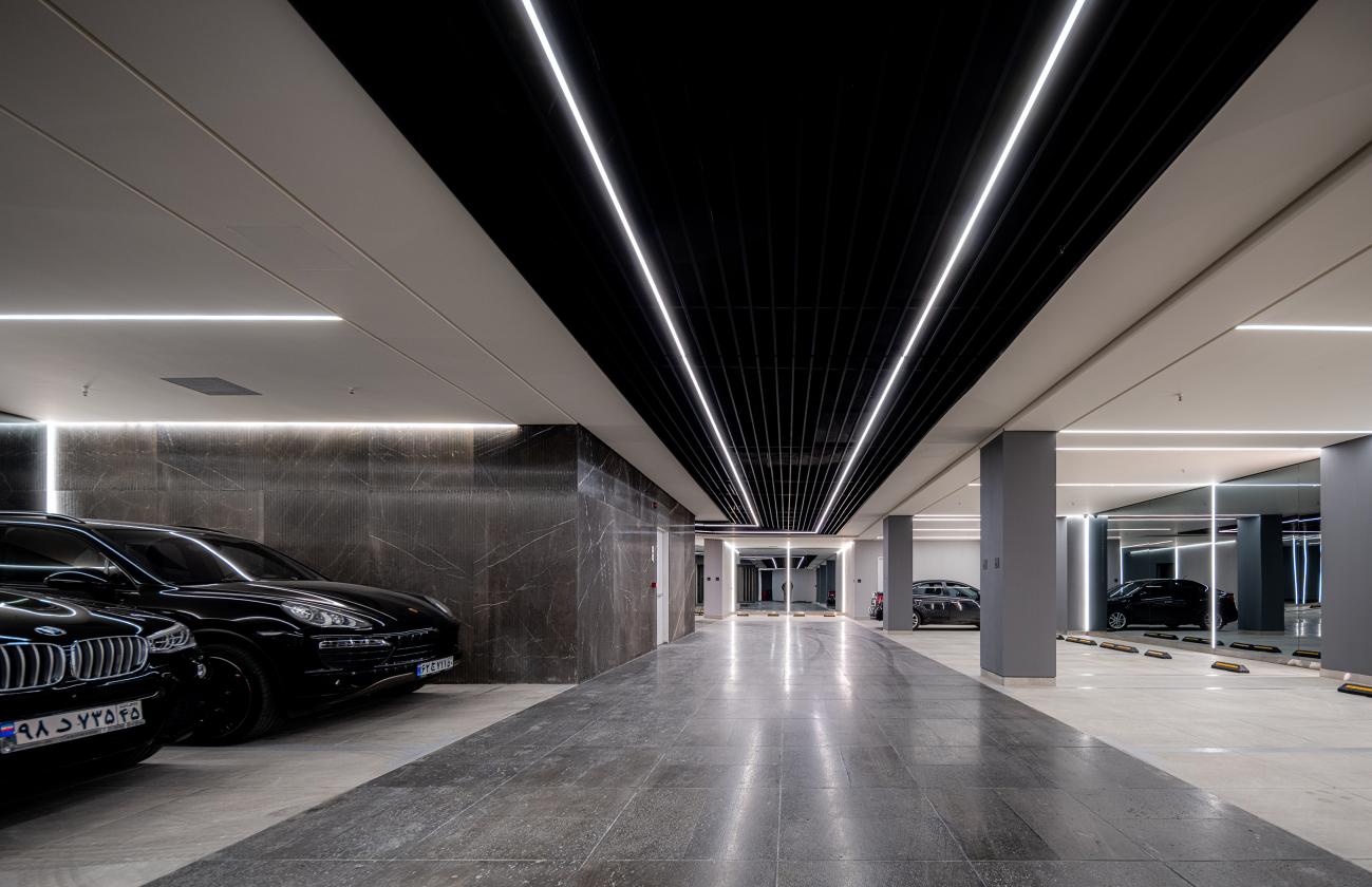 WohnhausTeheran, IranDas luxuriöse, 11-stöckige Apartmentgebäude im eleganten Fereshteh-Viertel im Norden Teherans ist speziell auf wohlhabende junge Paare zugeschnitten. In Bezug auf den Städtebau ist es bereits das dritte seiner Art in Teheran, das im gesamten Bauwerk innovatives Design von Hadi Teherani aufweist. Von außen betrachtet fällt das Gebäude mit dem Namen No. 23 Parsa Residence Tehran durch eine gekonnt variierte und grafisch dreidimensionale Fassadenszenerie auf. Bewegliche, elegante Lamellen in der Südfassade aus einem Metall mit modern interpretierten Ornamenten in Kombination mit einem nachhaltigen, trocken hinterlüfteten Fassadensystem aus Naturstein dienen der individuellen Abschirmung zwischen Privatsphäre und Öffentlichkeit. Wie bei den benachbarten Häusern öffnet das Gebäude die Fassaden in zwei Richtungen (Nord/Süd) und bietet spektakuläre Ausblicke auf die Berge und über die Metropole.