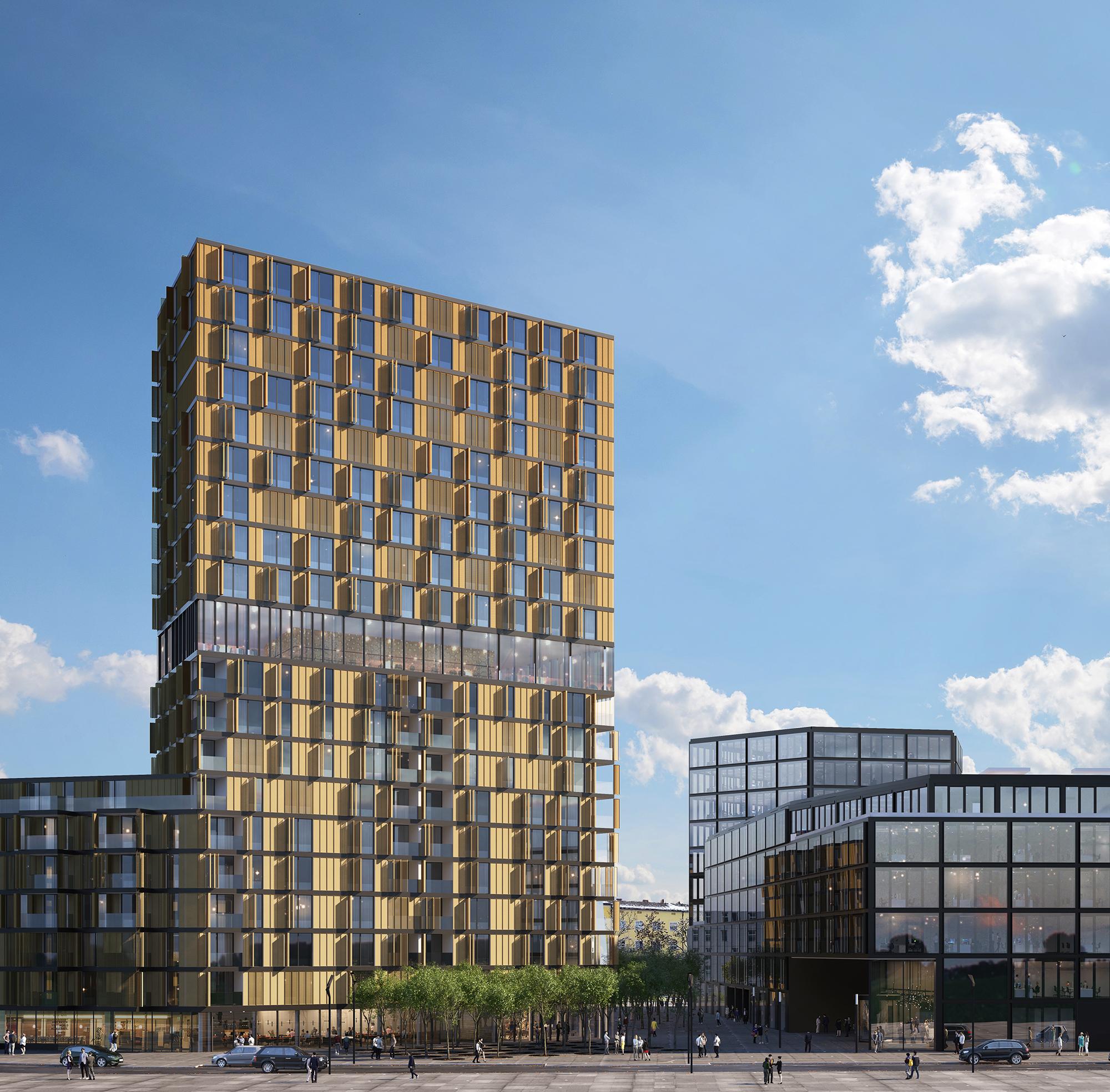 Der Turm von 20 Geschossen setzt am begrünten Platz, dem Bindeglied zum Werksviertel, städtebaulich ein markantes Zeichen für die notwendige Verdichtung der Stadt, schafft gleichzeitig aber auch den Spielraum für vielfältige Freiräume und zahlreiche Wohnungen mit unmittelbarem Bezug zu den begrünten Wohnhöfen.