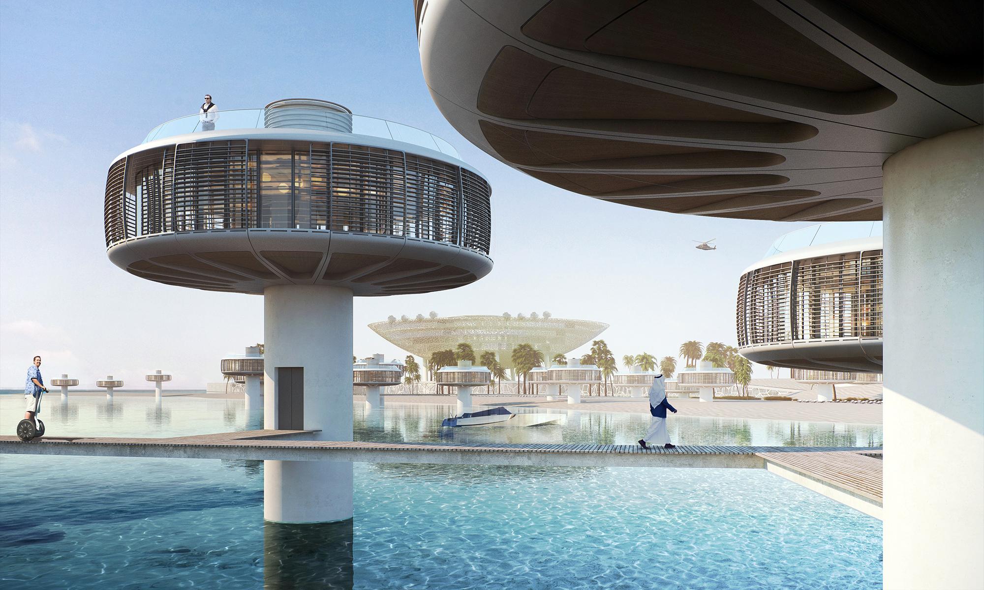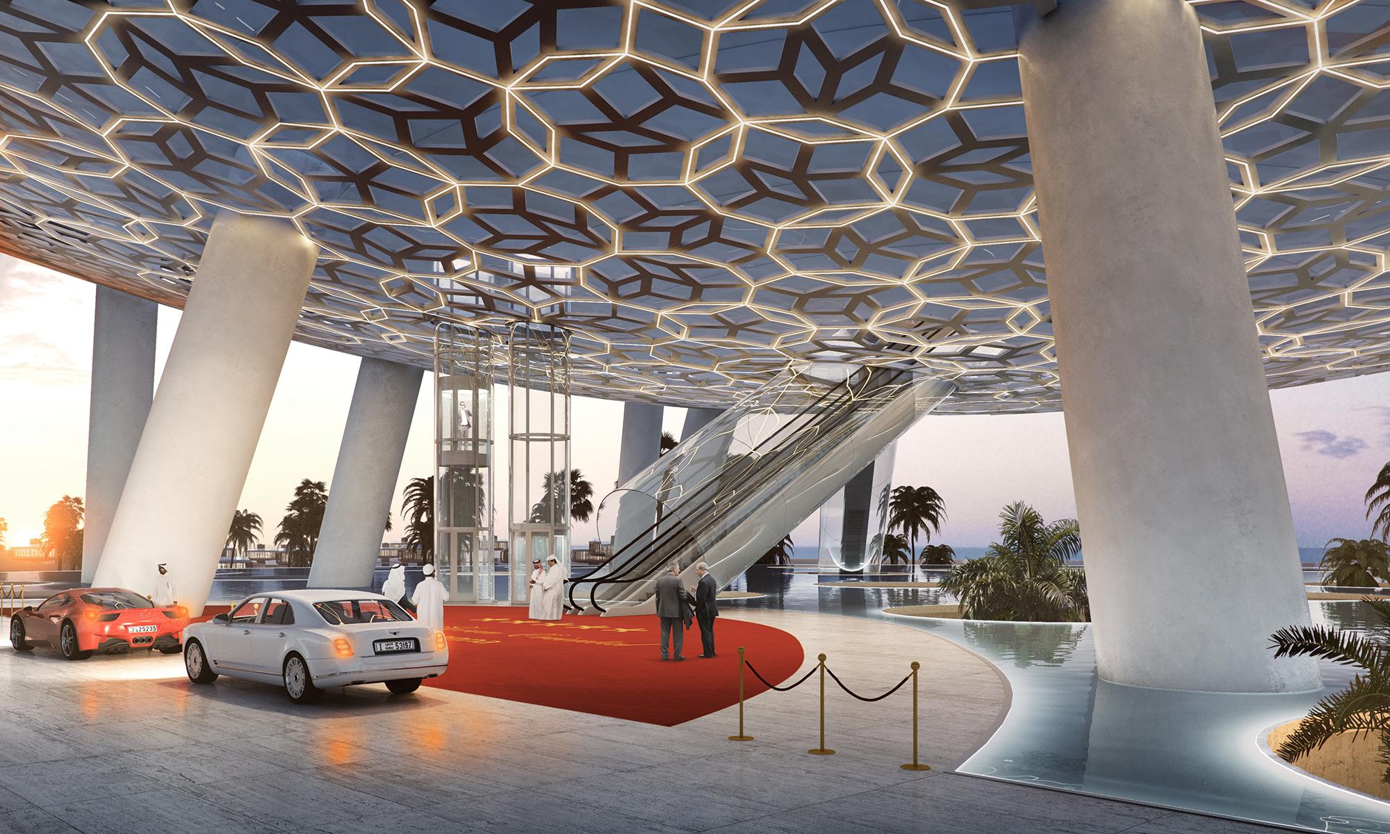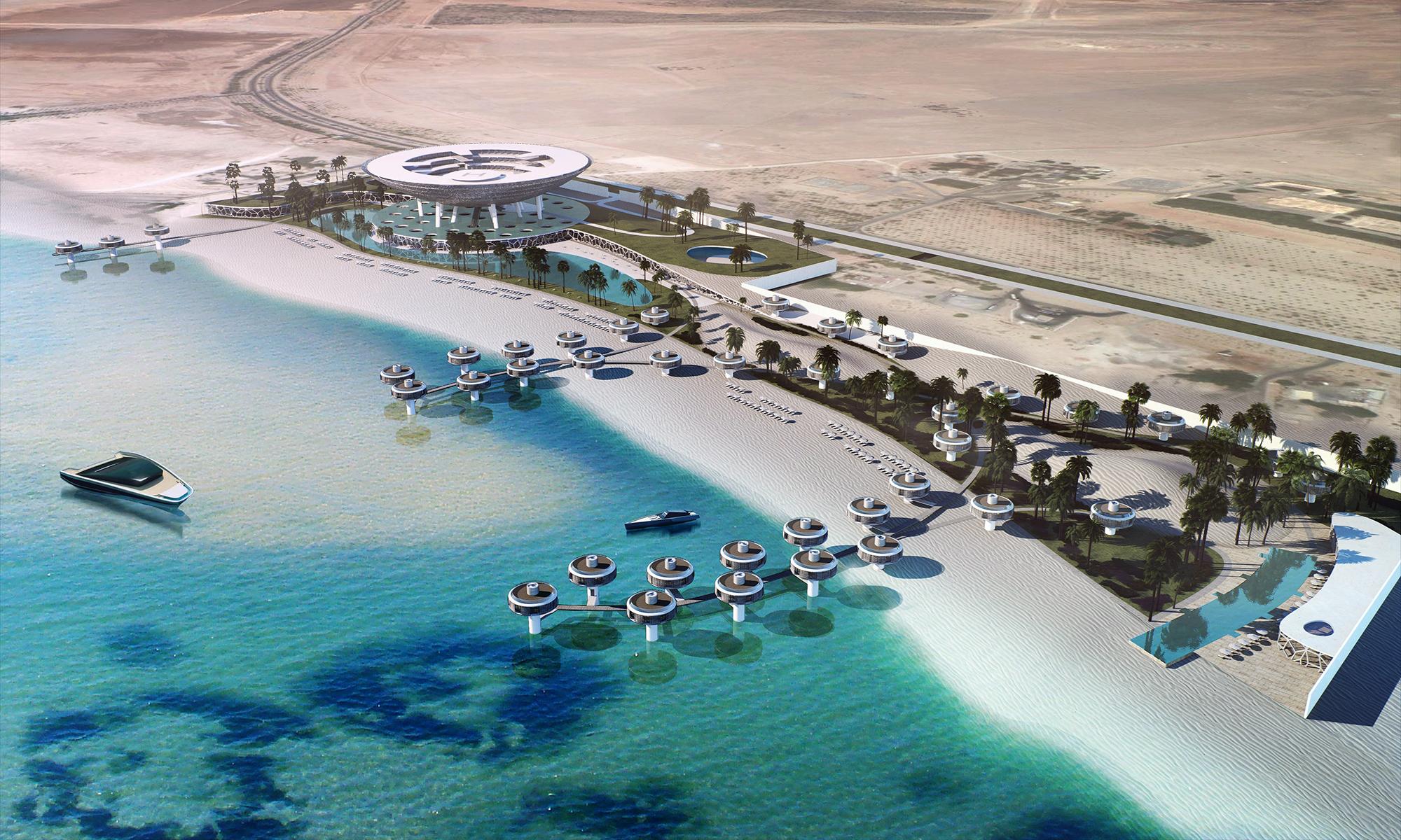 Eine 150 m im Durchmesser sich abzeichnende Halbschale schwebt über einem künstlichen See mit großzügigen Öffnungen für Terrassen- und schattenspendende Hofanlagen darunter. Von einer eindrucksvollen Vorfahrt gelangt der Besucher und Gast über eine Fahrtreppe in den Lobby Bereich des Hotels – eine Reise, die ihm schon vor der Ankunft auf seinem Zimmer das Gefühl vermitteln soll, „neue Welten“ zu betreten. Auf seinem Weg wird der Besucher mit eindrucksvollen Perspektiven über den nahen Golf und die Wüstenlandschaft belohnt. Die imposante Metallstruktur, die das gesamte Hotel umfasst und einhüllt, ist als Referenz an die reiche Kulturgeschichte des Landes gedacht und als zeitgenössische Interpretation traditioneller Ornamentik gestaltet. Sobald der Gast den inneren Hotelbereich betreten hat, erwarten ihn überdurchschnittlich großzügige Zimmer, die alle Ausblicke auf das Meer, die Lagune und die Dünenlandschaft bieten, sowie über einen vorgelagerten, privaten Garten verfügen. 40 private Villen sind über das Areal verteilt, teilweise im Meer, teilweise an Land oder in unterschiedlichen Vegetationshöhen positioniert, so dass Familien oder Langzeitgäste hier zusätzlich eine sehr individuelle, temporäre Residence besitzen können.