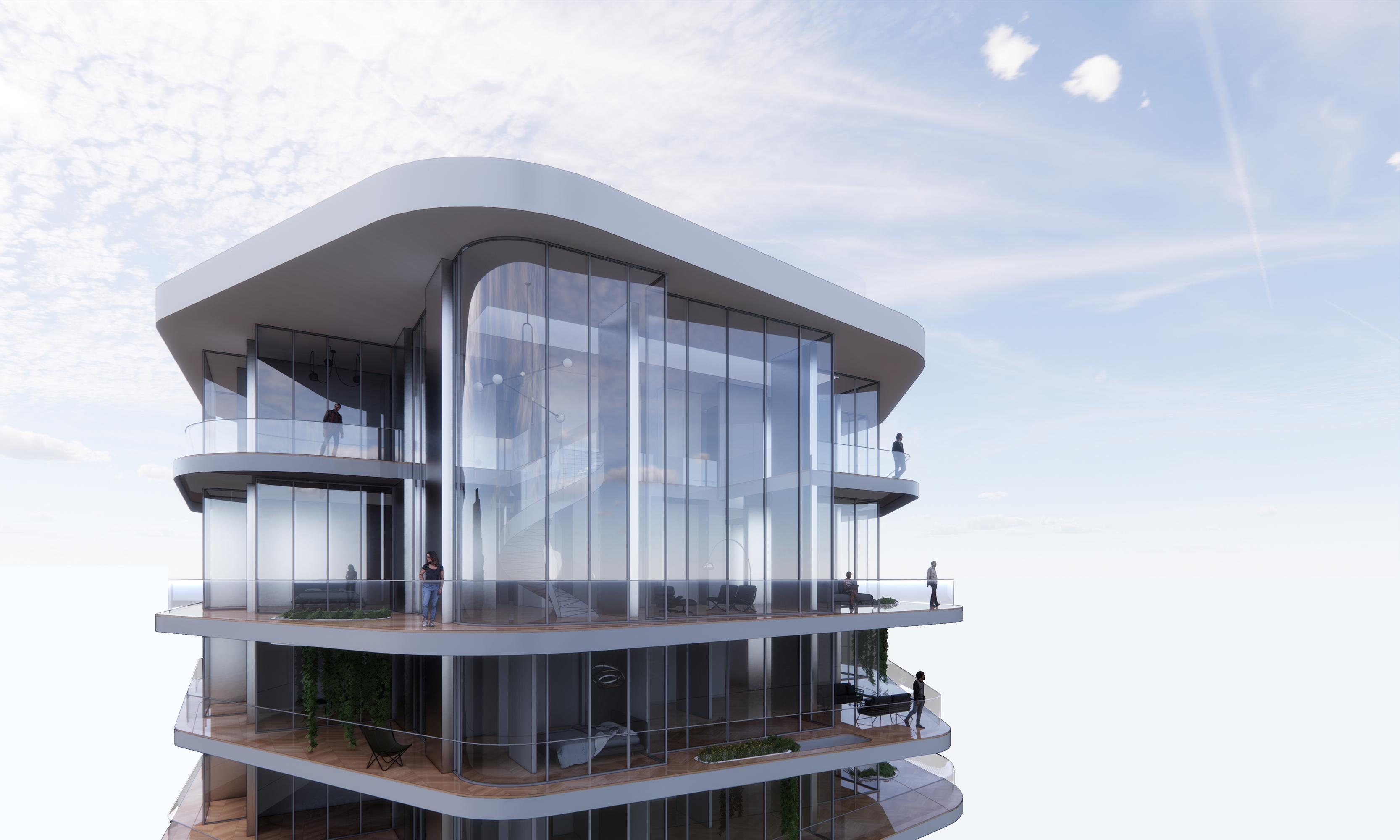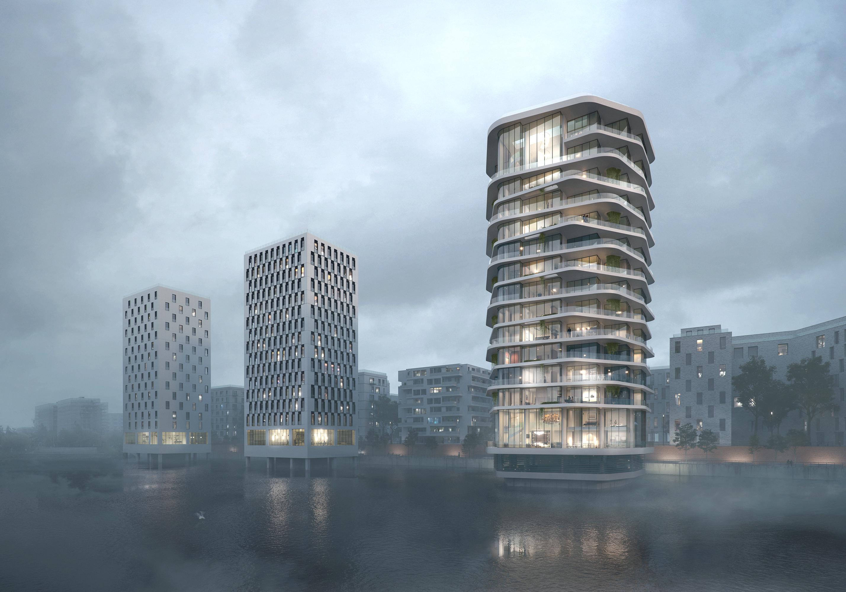 Wohnen am WasserHamburg HafenCity, D„Wohnen auf dem Wasser“ fasziniert die Menschen seit jeher - unser Entwurf (rechte Haus) nimmt diese Faszination auf und überträgt sie auf die Architektur: eine skulptural anmutende, vertikale Schichtung vermeintlich frei geformter horizontaler Ebenen ermöglicht aus jeder Wohnung maximale Ausblicke auf das Wasser. Weit auskragende private Terrassenflächen lassen die Grenze zwischen Innen und Außen verschwinden. Orthogonal organisierte Grundrisse treffen auf amorph geformte Außenflächen, welche durch die Wellen des Wassers geformt zu sein scheinen. Es entsteht von außen betrachtet ein Solitär mit starker Identität welcher der eher städtebaulich geordneten, orthogonalen Struktur der Landbebauung einen spannenden, formal eher „weicheren“ Kontrapunkt bietet. Durch die Lage „im Wasser“ ist dieser Freiheitsgrad gegeben – auch zu den beiden weiteren Wasserhäusern wird der Turm interessante wechselseitige Beziehungen erzeugen.