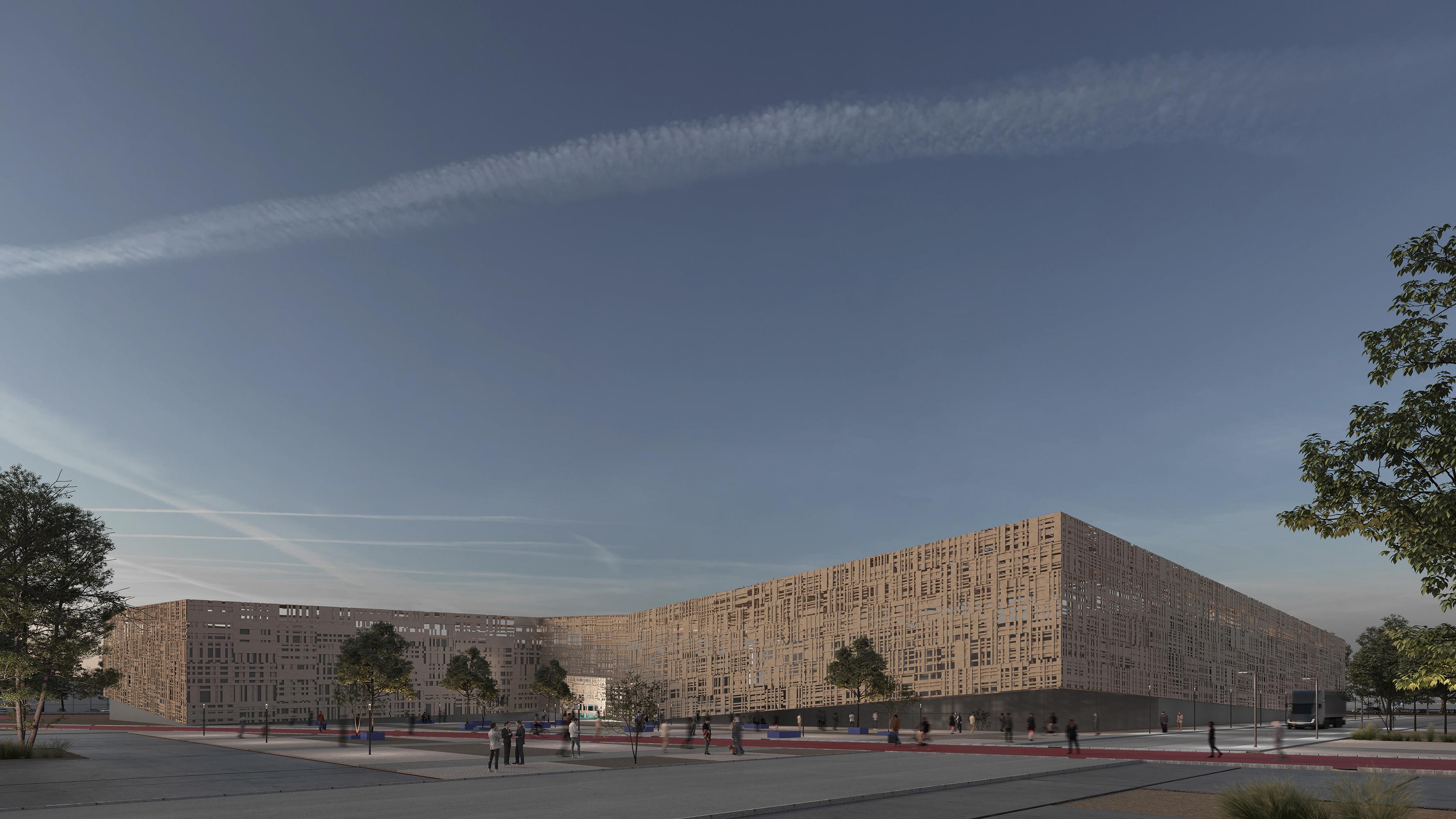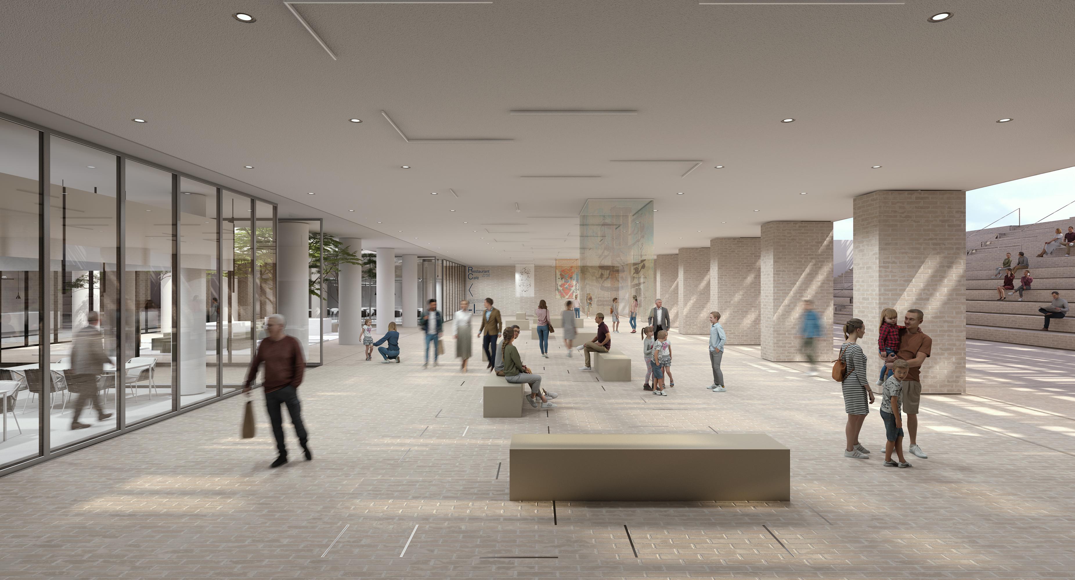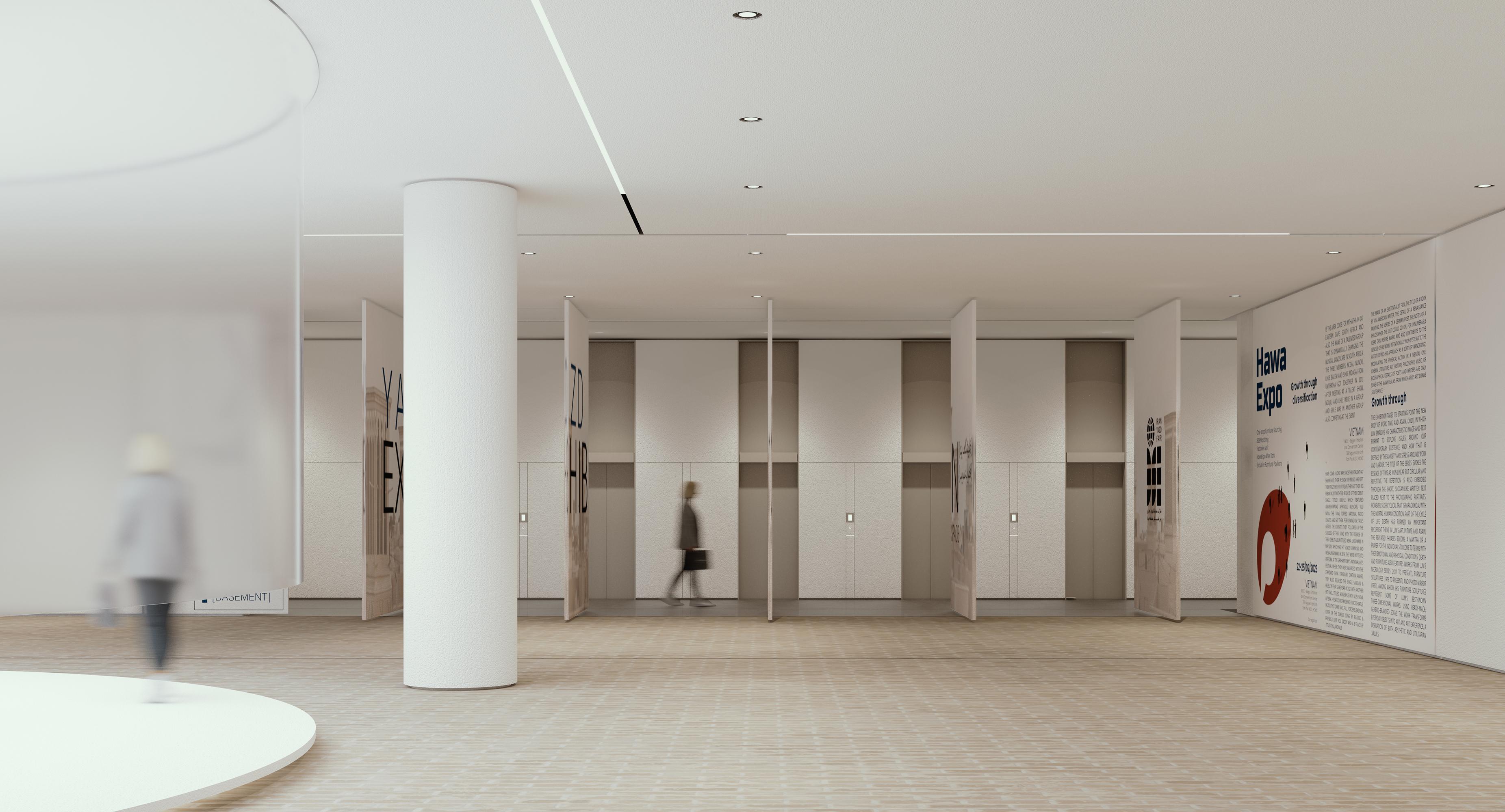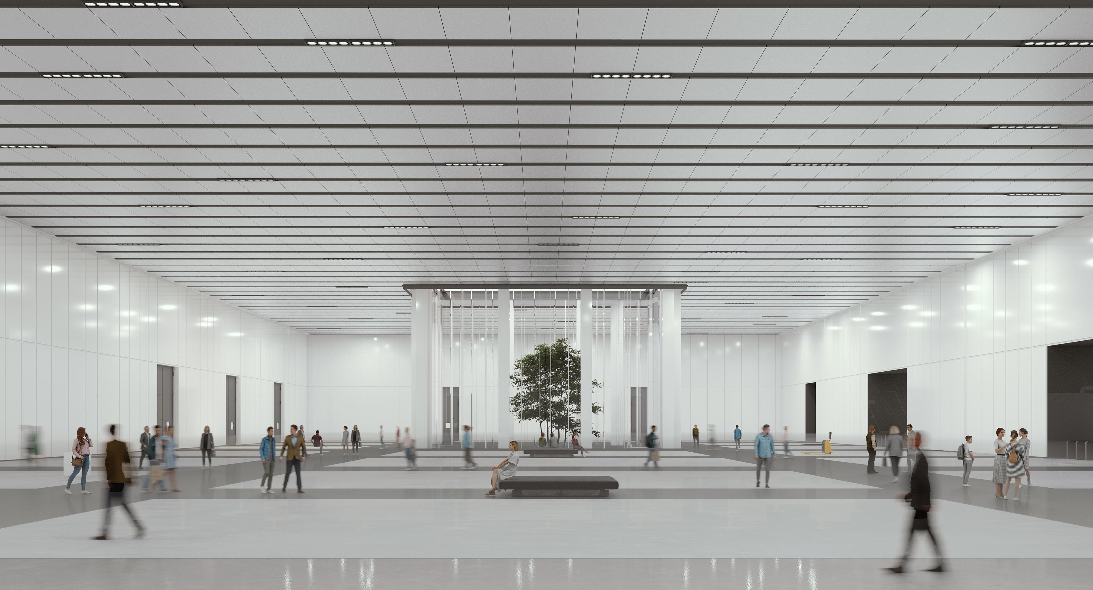 The core of the general masterplan is comprised by two new exhibition halls, with the central entrance hall directly accessible from the master boulevard located southeast of the existing trade fair hall. Located only footsteps away from the central boulevard and attached to the northern hall is a shaded outdoor cinema, a 25-meter, cantilever-roofed plaza for around 400 viewers and guests. The outer plaza grants access to the subterranean level with its embedded office and restaurant facilities via large, inviting staircases. The central entrance hall on the ground-floor level with reception desk, wardrobes and service facilities provides access to the 7000 m² and 5000 m² exhibition halls. This ensemble of exhibition halls has been designed while taking international standards into consideration, yet at the same time with regard to its genius loci and architectural background heritage. The demandingly superior engineered structure and MEP systems go hand in hand with its state-of-the-art architecture and interiors. The two 100 m x 50 m and 70 m x 50 m column-free structures provide optimally flexible space for any type of exhibition, trade show or concert. Two central courtyards implemented inside the halls provide naturally shaded daylight access to exhibitions and connect the ground-floor level with the subterranean level both physically and visually.
